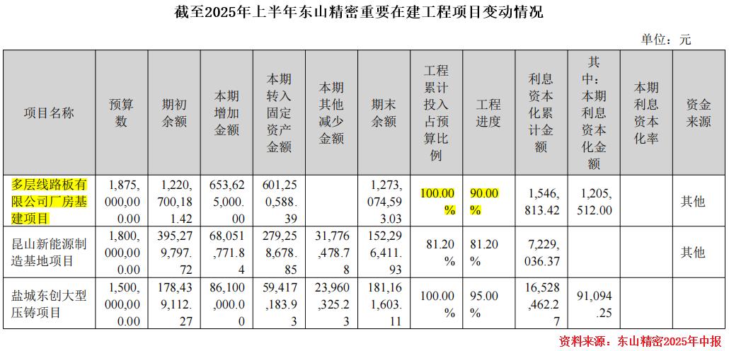 先是投资建厂房。早先公司拟投资18.75亿元建设多层线路板厂房,截至2025年上半年,该项目的“工程累计投入占预算比”已经达到100%,工程进度也达到了90%。