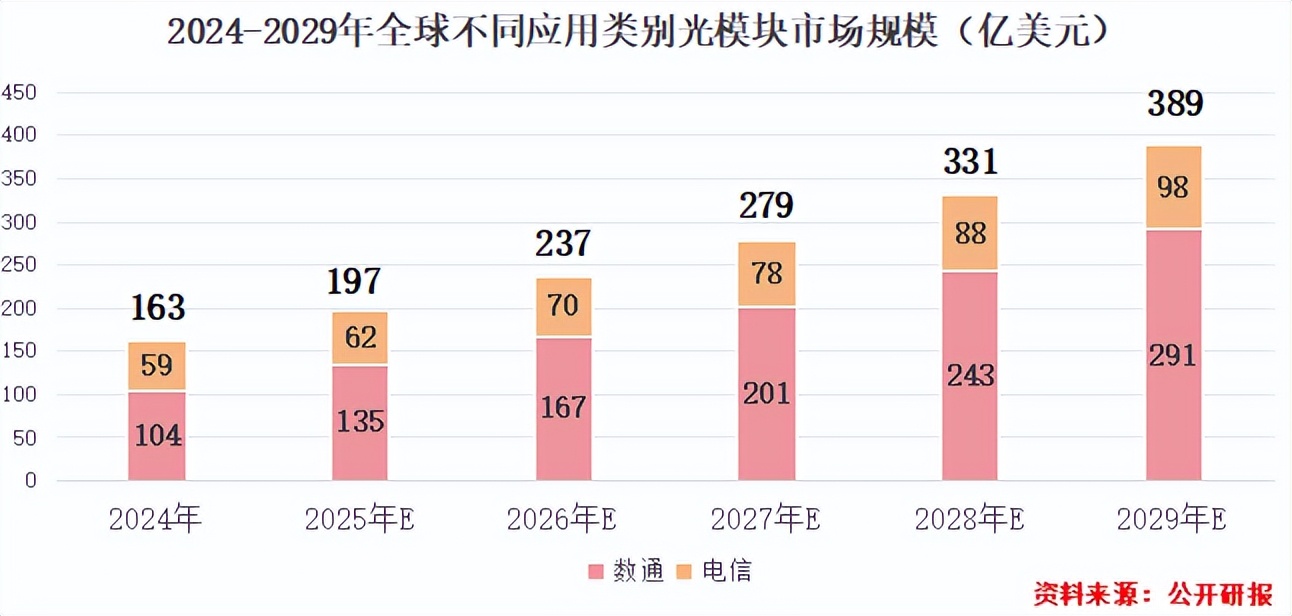据预测,2024-2029年,全球数通光模块市场规模将从104亿美元增长至291亿美元,足足提高了2倍。