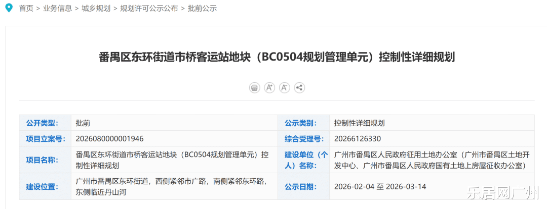 广州规自局发布最新《番禺区东环街道市桥客运站地块控制性详细规划征询意见公示》。