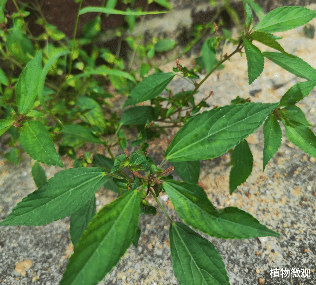 铁苋菜植株不高,通常不超过50厘米,它的叶子互生,叶片椭圆形至卵状菱形,叶片有皱纹且粗糙如麻。因此在有的地方,铁苋菜也有黄麻叶、野黄麻的名称。在《本草纲目拾遗》中就有收录此草,并且还详细记载了铁苋菜的形态特征,描述其为:“三月生苗如麻,叶有微毛......夏开花细紫红色,自五月起至十月止,处处有之”,说的就是咱们今天的主人公铁苋菜。