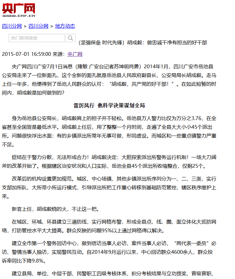 在胡成毅担任岳池县政府副县长、县公安局局长期间,曾在2015年7月1日被央广网以”(坚强保垒 时代先锋)胡成毅:做忠诚干净有担当的好干部“为题做了一期专题报道,文中对胡成毅高度评价,称胡成毅”雷厉风行 他科学决策谋划全局;勤勉敬业 他用心实干破除万难;牢记使命 他尽心竭力为民谋利。“