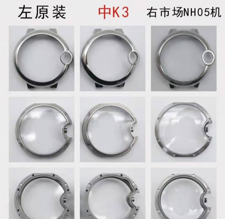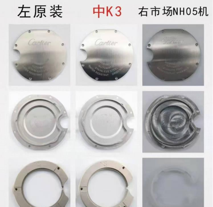 后盖细节方面,3k和af的底盖刻字及打磨,做工细节都做得到位。不过,3k的内罩用的铜材质,喷砂效果和正品一致。af厂的NH05机芯用的是胶内罩。