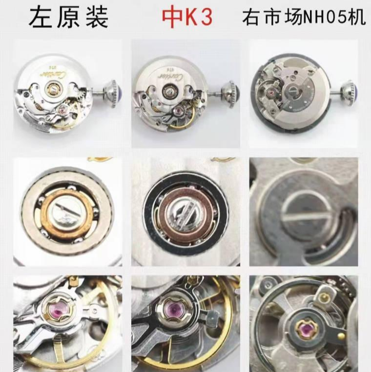 接下来,我们来看一下机芯细节方面,在整体还原度方面,3k的076机芯基本上与原版一致,不管是机芯的夹板,打磨,刻字等方面,而af采用的NH05机芯,还原度相差比较大。不过,蓝气球是密底设计,不拆后盖看不到机芯。