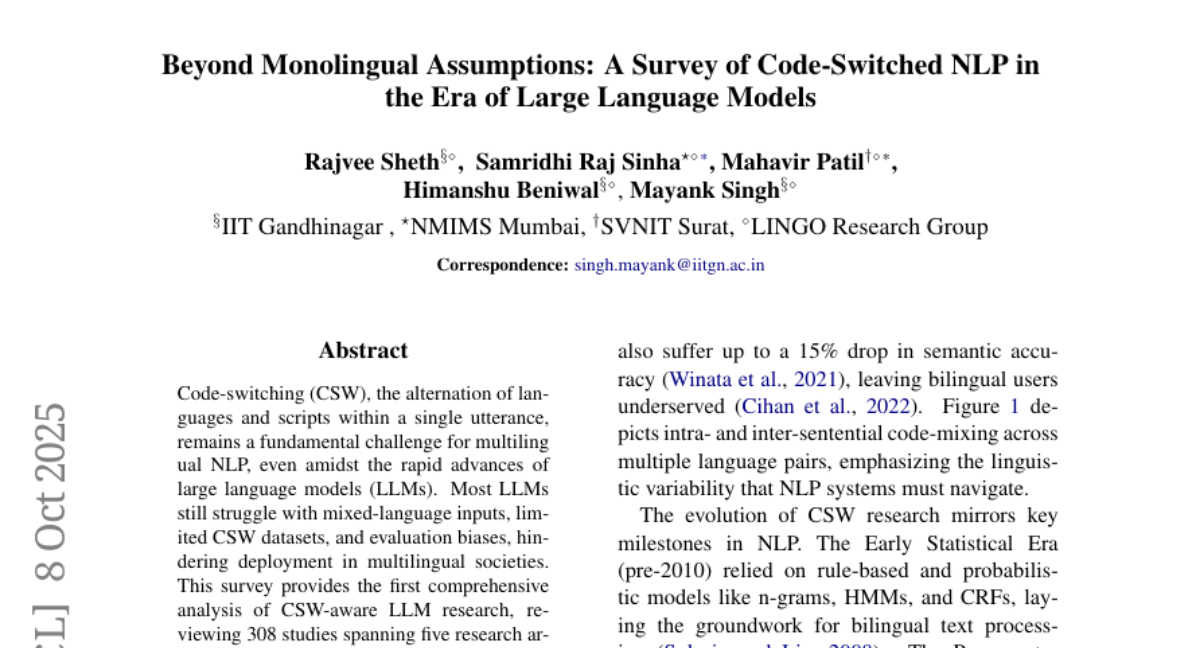 由印度理工学院甘地那加分校的辛格教授团队领导的这项研究发表于2025年10月,题为《超越单语假设:大语言模型时代的语码转换自然语言处理综合调研》。这是迄今为止关于语码转换研究最全面的学术报告,涵盖了308项研究成果,横跨80多种语言。感兴趣的读者可以通过论文编号arXiv:2510.07037查询完整论文。