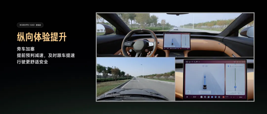 行车感受大幅提升:强化学习下的行车质感细腻丝滑、更拟人,提供全域安心的驾乘体验经过「强化学习+世界模型」的持续训练,Xiaomi HAD 增强版在三大核心行车场景中实现了显著提升:纵向加减速更丝滑、横向变道更果断、路口选择更精准。这些行车能力的系统性提升,最终体现在全场景通行能力的显著进步上。无论是城市拥堵路段、复杂路口,还是高速公路,系统都能展现出更接近人类驾驶员的判断与操作水准,为用户驾乘带来切实的安心感。首先,纵向控制的加减速更符合预期。行车过程中旁车突然加塞,这几乎是我们每天开车都会遇到的场景,即使人开也容易出现大力刹车的情况。经过强化学习训练后,大模型能更精准地预测加塞,系统不会过度反应,减速更平稳,跟车的舒适感和安心感大幅提升。