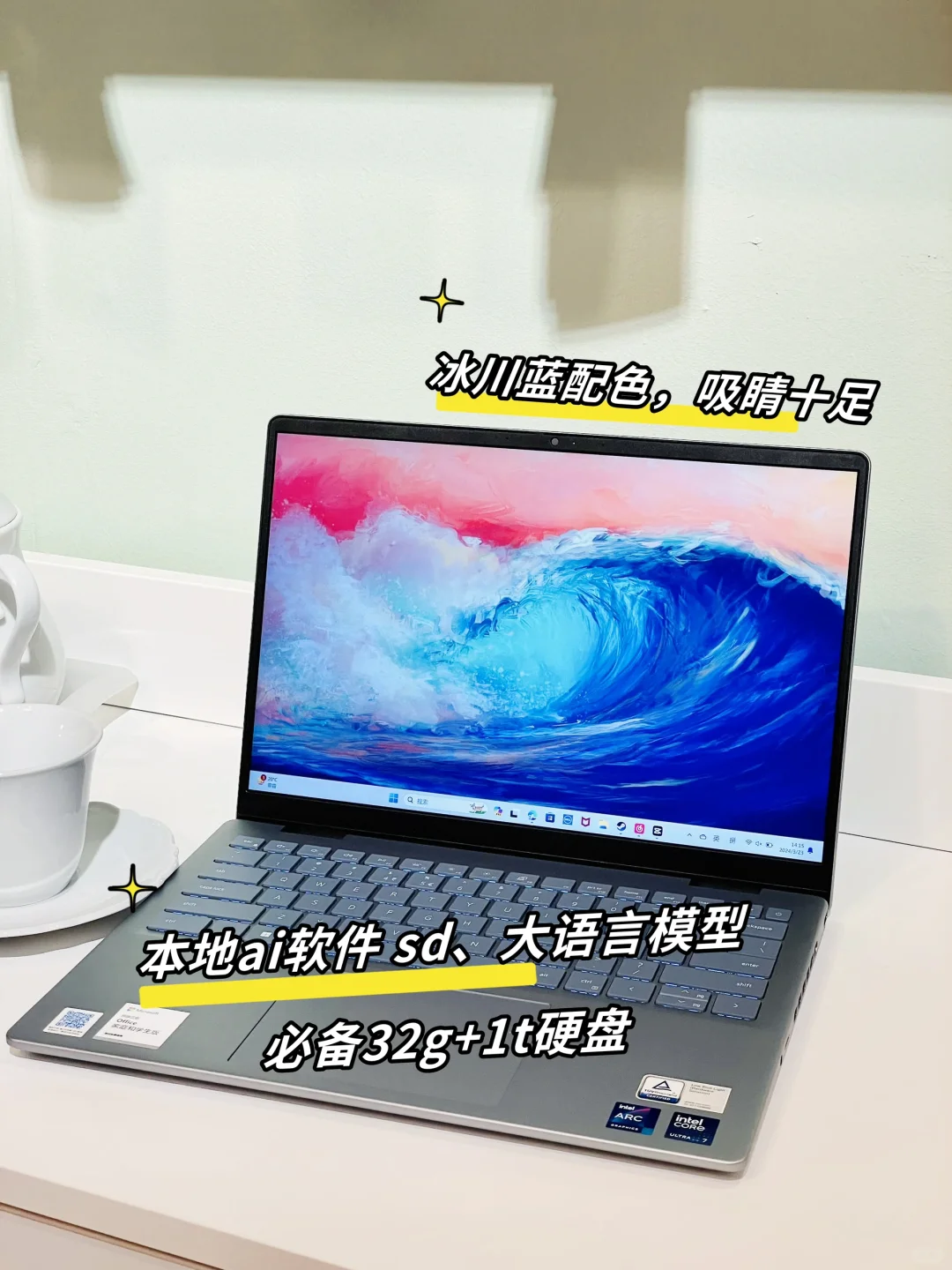 我看上它的另外一点就是其45w的满血功耗+15小时的超长续航。我这人习惯在各种咖啡厅☕️坐着写东西,所以超长的续航对我来说真的是刚需。而且它还有有着32G内存+1T的大容量,也是大型ai软件刚需配置,整体机身轻薄小巧,而且还是冰川蓝的配色,在外面用着非常有高级感。