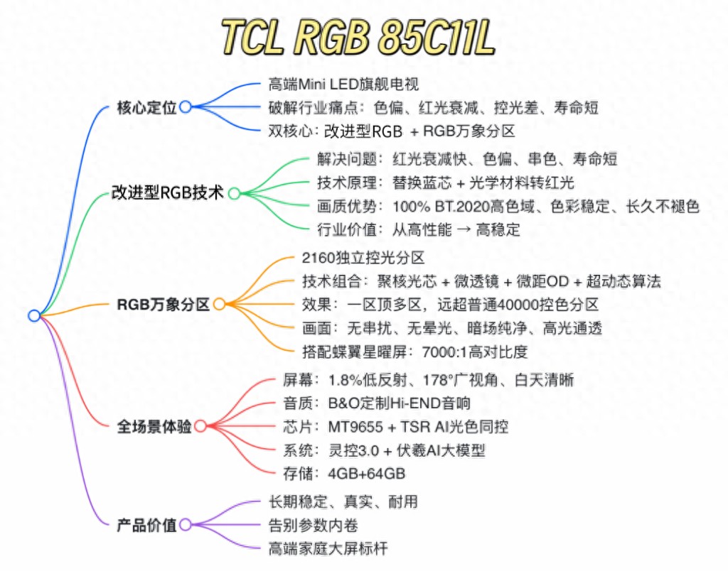 Mini LED技术发展至今,已成为高端电视市场的主流显示方案,但在技术普及的背后,行业依然存在诸多等待突破的底层难题。不少产品看似参数拉满,却在长期使用稳定性、色彩一致性、光影控场能力等核心体验上留有短板。想要真正打破技术瓶颈,依靠的并非小修小补的表层优化,而是从根源出发的底层架构重构。面对这一行业共性挑战,TCL RGB 85C11L给出了一套全新的解题思路。它没有陷入同质化参数内卷,而是聚焦用户真正在意的核心体验实现关键突破,凭借一套更成熟、更系统的技术逻辑,重新定义了高端大屏的画质标准与使用体验。
