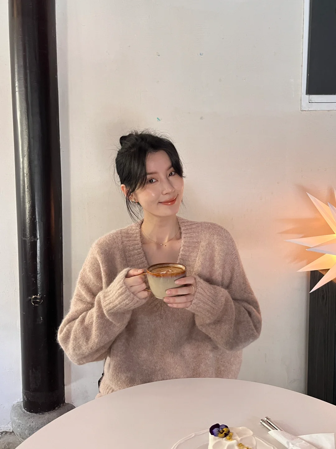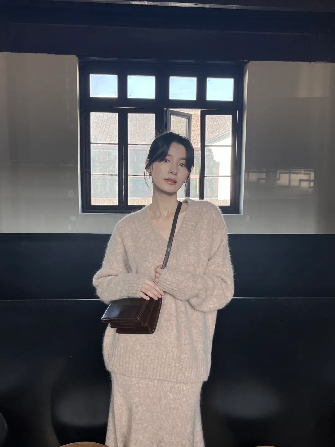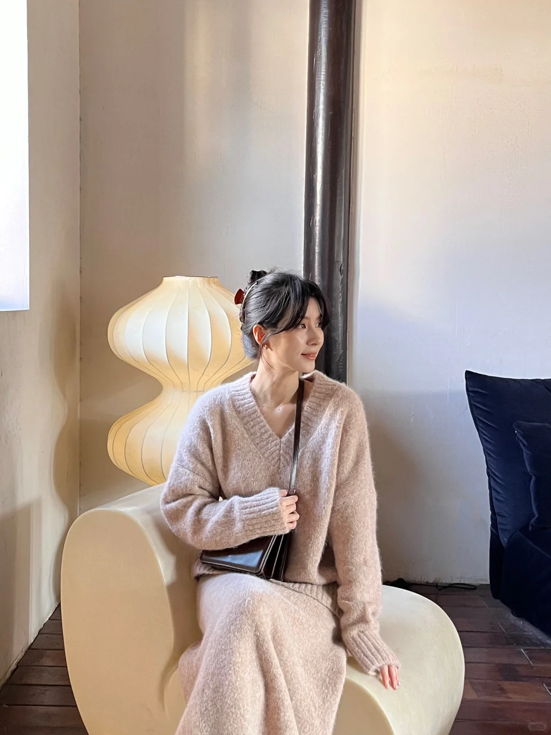 这套上身真得好温柔! 厚厚的毛感朦胧美拉满! 色调又是复古调调的粉驼色, 如果搭上一条厚厚的围巾圣诞感满满!