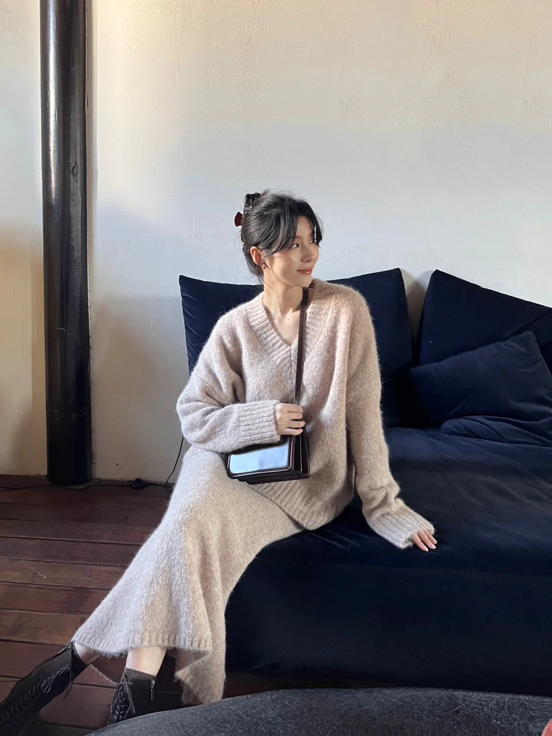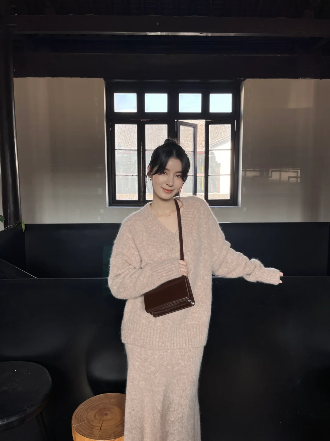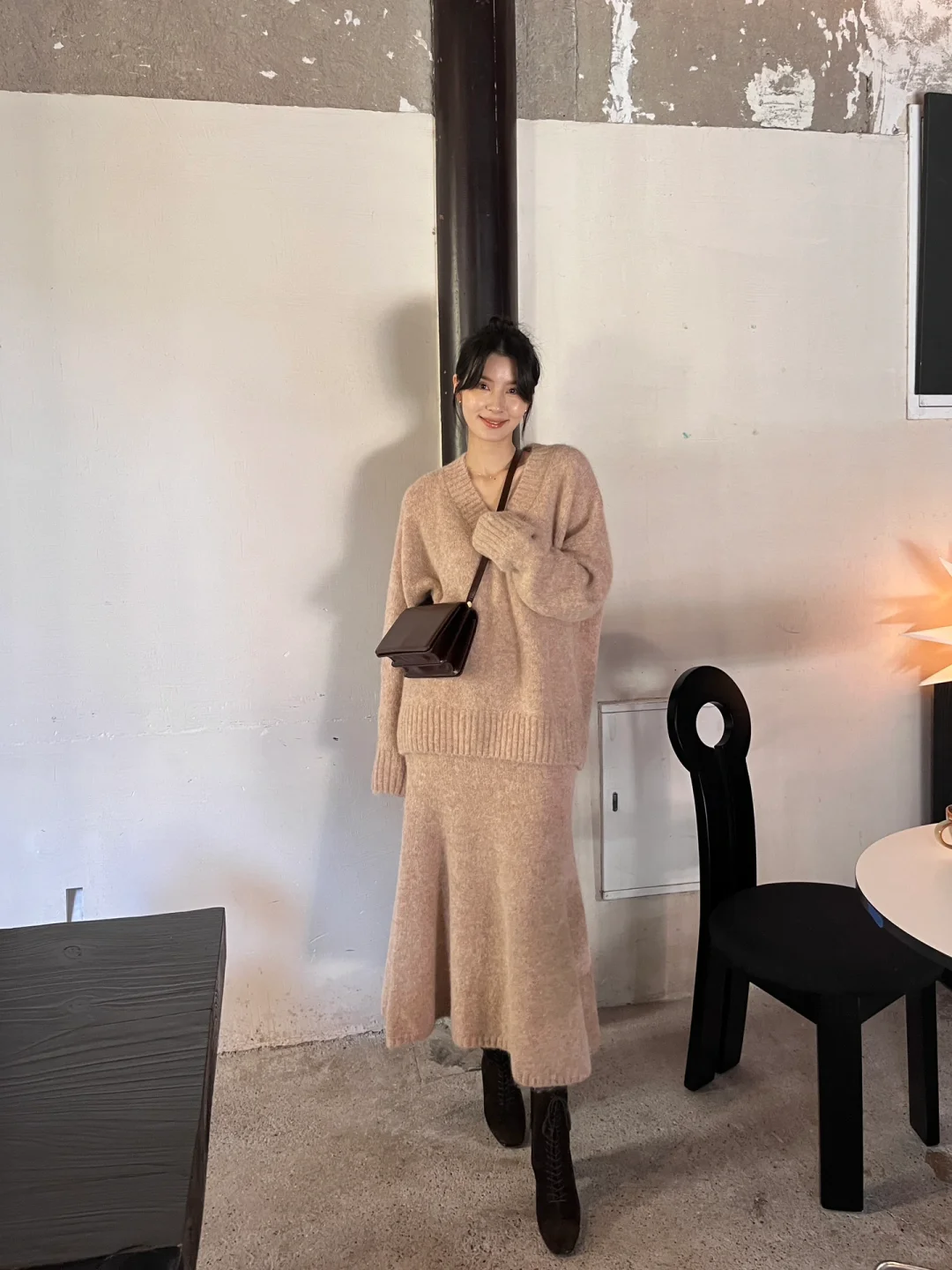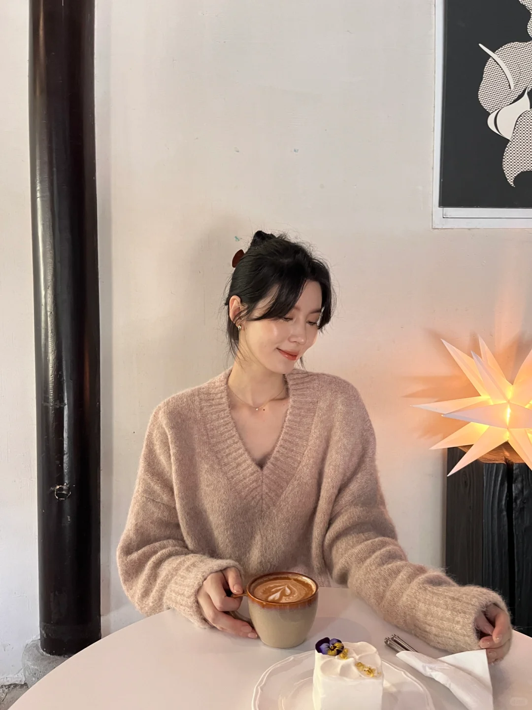 这套上身真得好温柔! 厚厚的毛感朦胧美拉满! 色调又是复古调调的粉驼色, 如果搭上一条厚厚的围巾圣诞感满满!