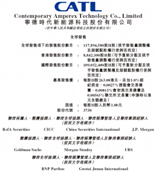 5月12日,宁德时代披露了发行阶段董事会公告及刊登注册招股书,宣布正式启动国际配售簿记,预计于5月20日在香港联交所主板上市交易。按发行价格上限每股263.00港元计算,本次港股IPO发行规模预计将达到40亿-50亿美元。