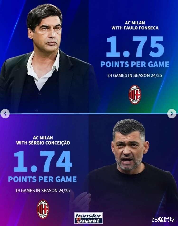 隔壁AC米兰的戏码比这更精彩,而且一个赛季还上演了两回!首先是去年夏窗签下的新帅丰塞卡,但他执教不到半年就下课,一方面是他执教战绩不佳,任上胜率只有50%,当然最主要的还是失去了对更衣室的控制,他采取了胡萝卜+大棒的管理策略,而不是像皮奥利一样哄着球员,这导致他与队内莱奥、特奥等多名核心球员发生矛盾,两人甚至在比赛中上演过“场边喝水门”事件,这相当于将更衣室矛盾公之于众,这加速了丰塞卡的下课。