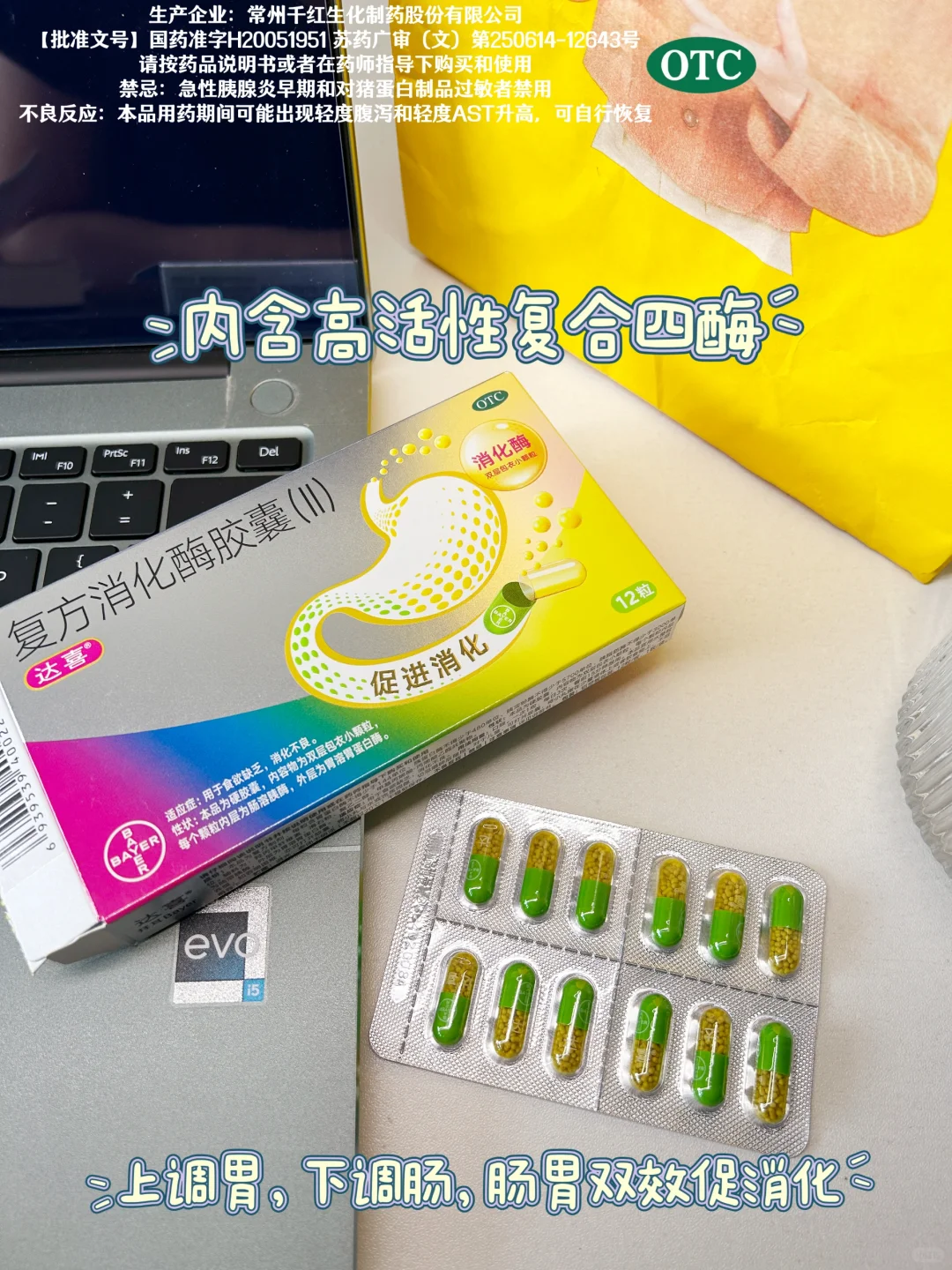 ◼️上次塔塔公司聚会吃多了,胃里就感觉鼓得像个气球,胀得难受,于是速速在美团下单了一盒达喜消化酶。达喜消化酶内含高活性复合四酶,不管是油炸零食、高油盐的外卖还是聚餐的大鱼大肉,基本都能被它轻松消化掉;而且这个消化酶还是直接从生物里面提取出来的,成分温和,也不会刺激到肠胃,不用担心对胃造成伤害;用的还是双层包衣,上调胃,下调肠,肠胃双效促消化,消化不好的时候直接来上一颗,轻松促消化