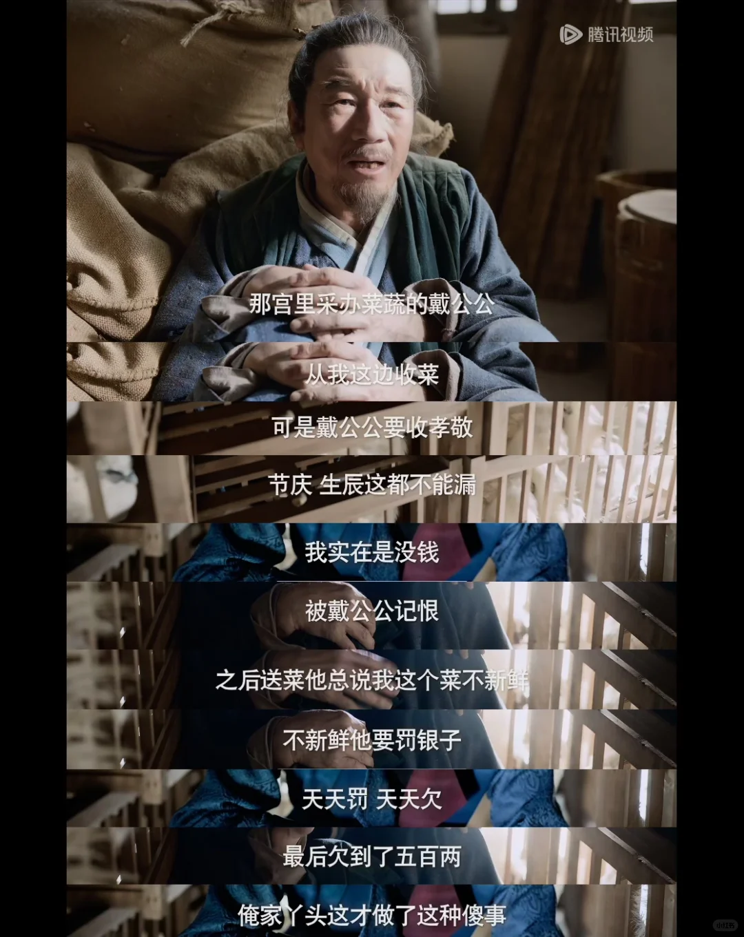 金老头原本是给宫里送菜的,却被管事公公收取回扣,回扣拿不出来,管事公公就诬陷他的菜不新鲜以此扣钱,直至欠下500两。