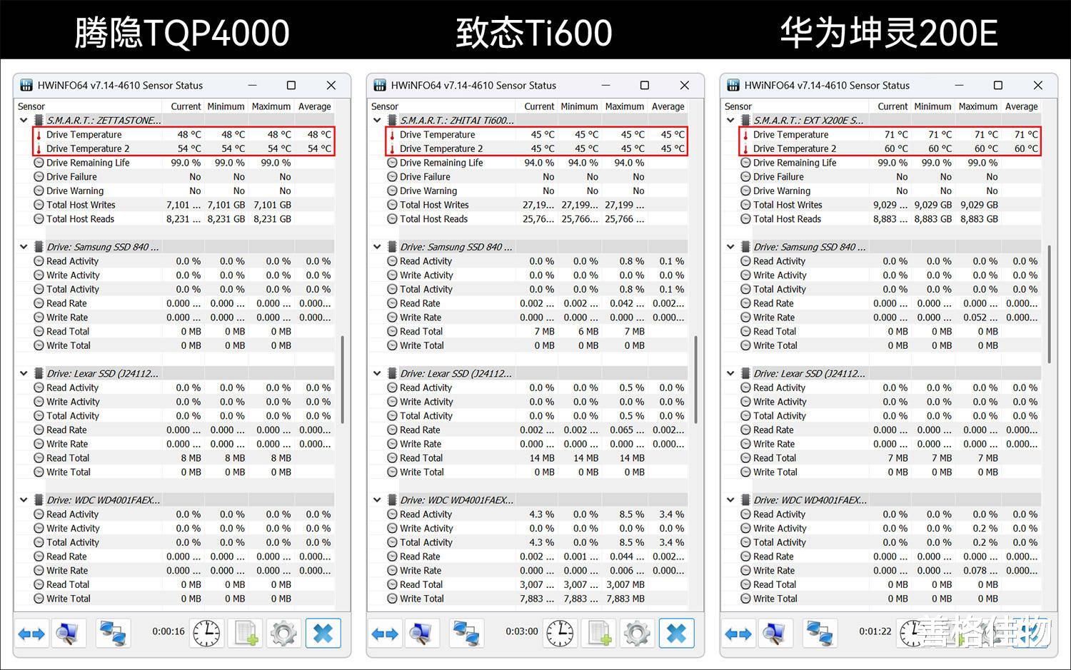 温控方面,致态Ti600的表现最好,最高只有45℃,腾隐TQP4000为54℃,华为坤灵200E最高温度达到了71℃,不知道不正常的读取速度是否和这个有关。