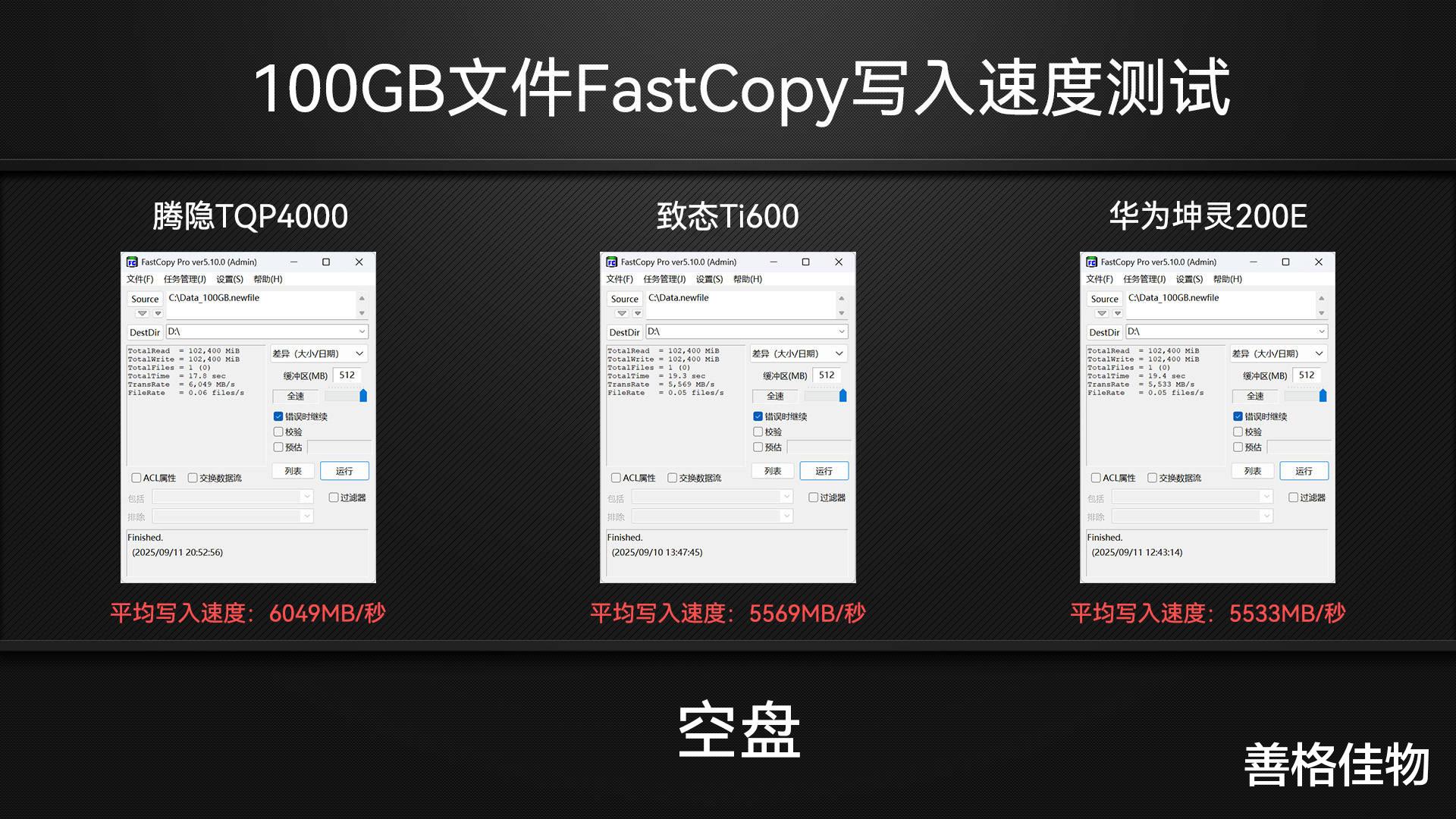 用FastCopy进行100GB文件写入测试,腾隐TQP4000表现小胜,平均写入速度达到了6049MB/s,致态Ti600和华为坤灵200E都在5500MB/s左右。