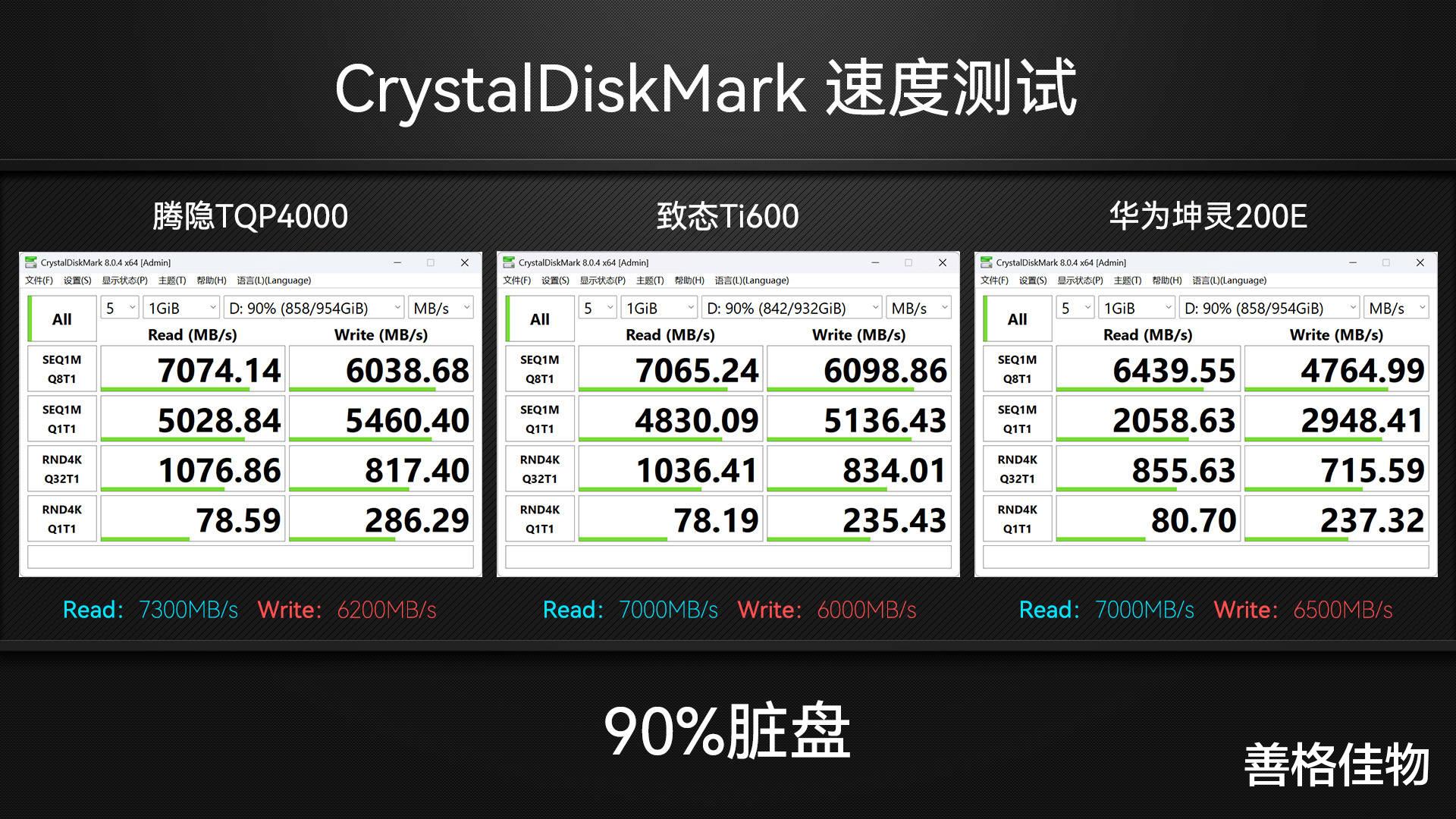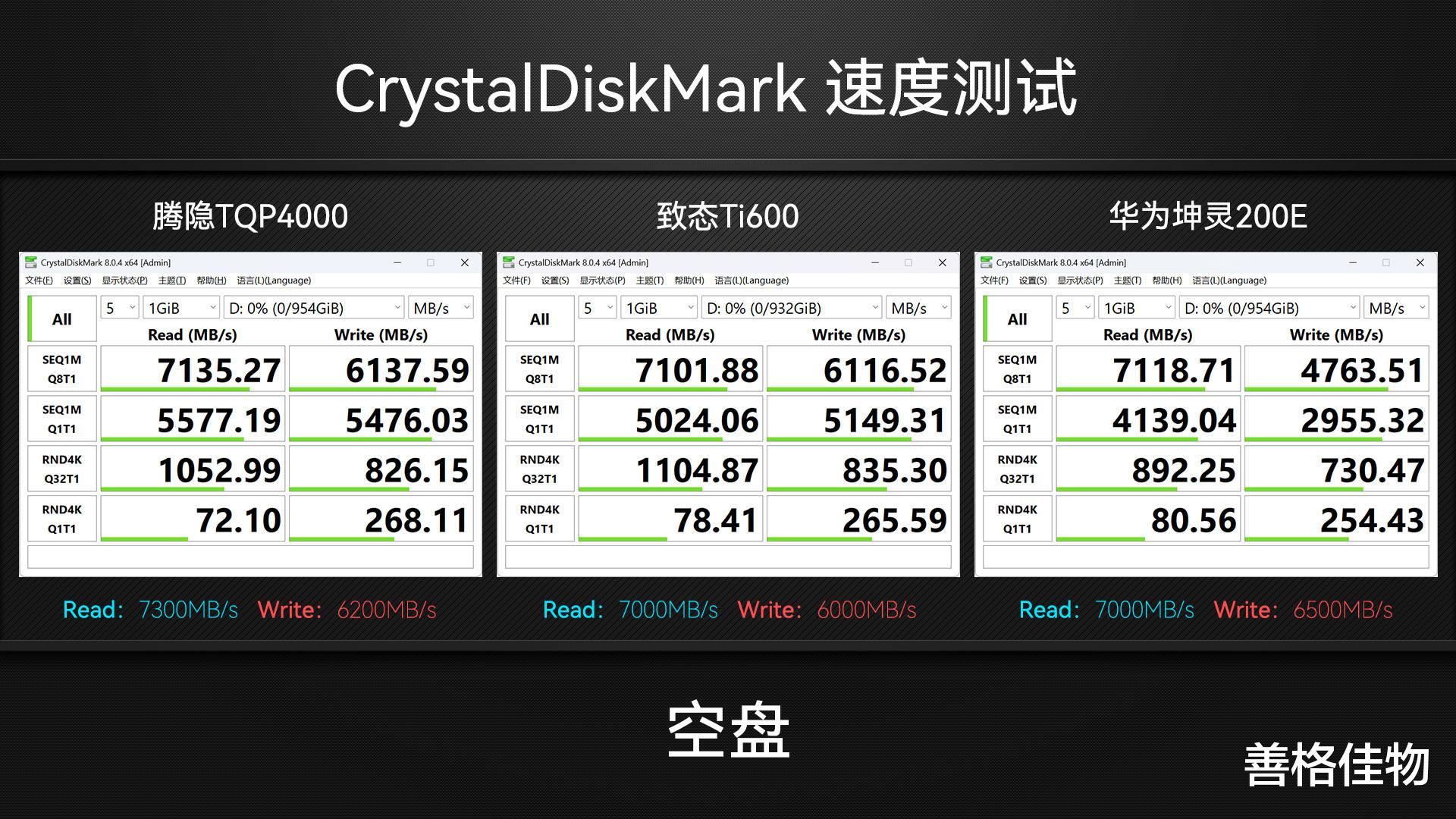 空盘状态下进行CrystalDiskMark测速,腾隐TQP4000和致态Ti600的表现在伯仲之间,都比较稳定,达到了标称水准,华为坤灵200E的顺序读取速度很正常,但写入速度就比较迷,只有4763MB/s,Q1T1还不到3000MB/s,测试几次都是差不多的结果。