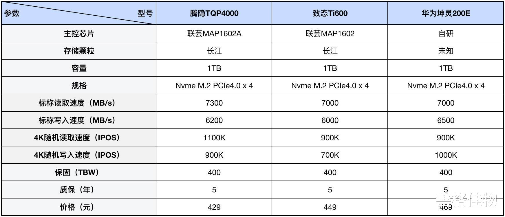 这3款硬盘都是Nvme M.2 PCIe4.0规格,容量1TB,其中腾隐TQP4000和致态Ti600采用了联芸主控+长存颗粒存储方案,而华为坤灵200E是自研的主控,存储颗粒未知,其它方面如标称速度、保修、价格等如下表所示,从纸面参数来看,基本处于同一水平线上,没有特别大的差距,这是横评的基准,否则就失去了对比的意义了。