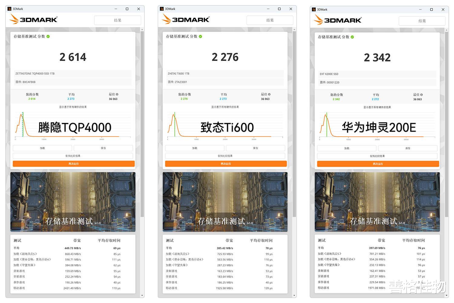 3DMark的存储基准测试,可以衡量磁盘对游戏体验的影响,比如游戏安装、加载、录制、保存进度等,腾隐TQP4000以2614分成绩领先致态Ti600的2276分和华为坤灵200E的2342分。
