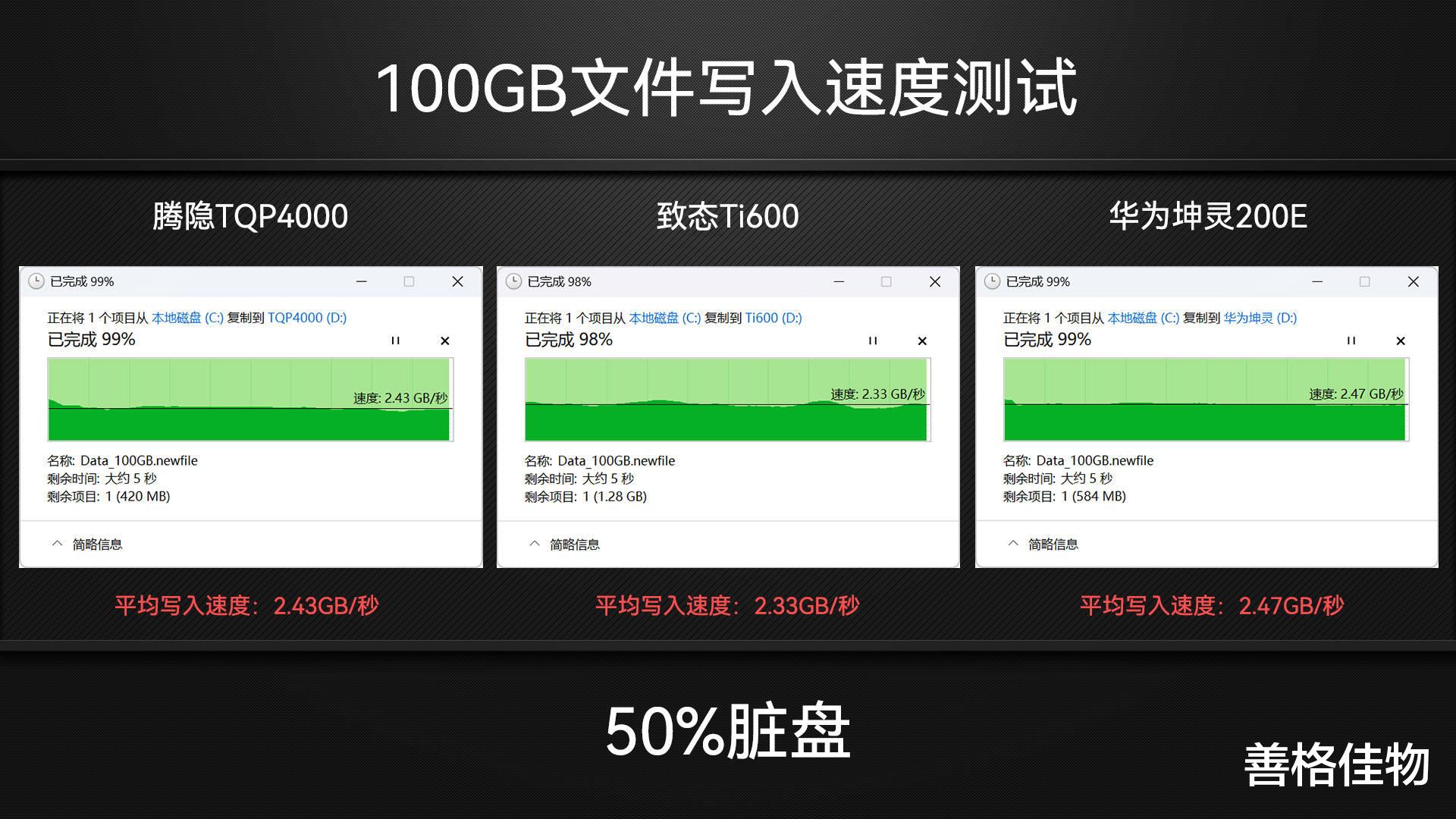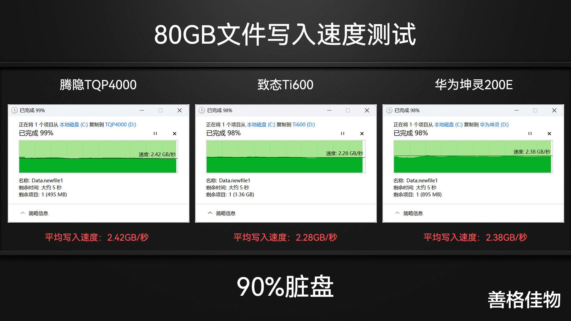 硬盘被占用了90%容量,100GB文件无法写入,所以改用80GB大小文件进行Windows写入测试,腾隐TQP4000和致态Ti600以及华为坤灵200E的速度总体来说都比较平稳。