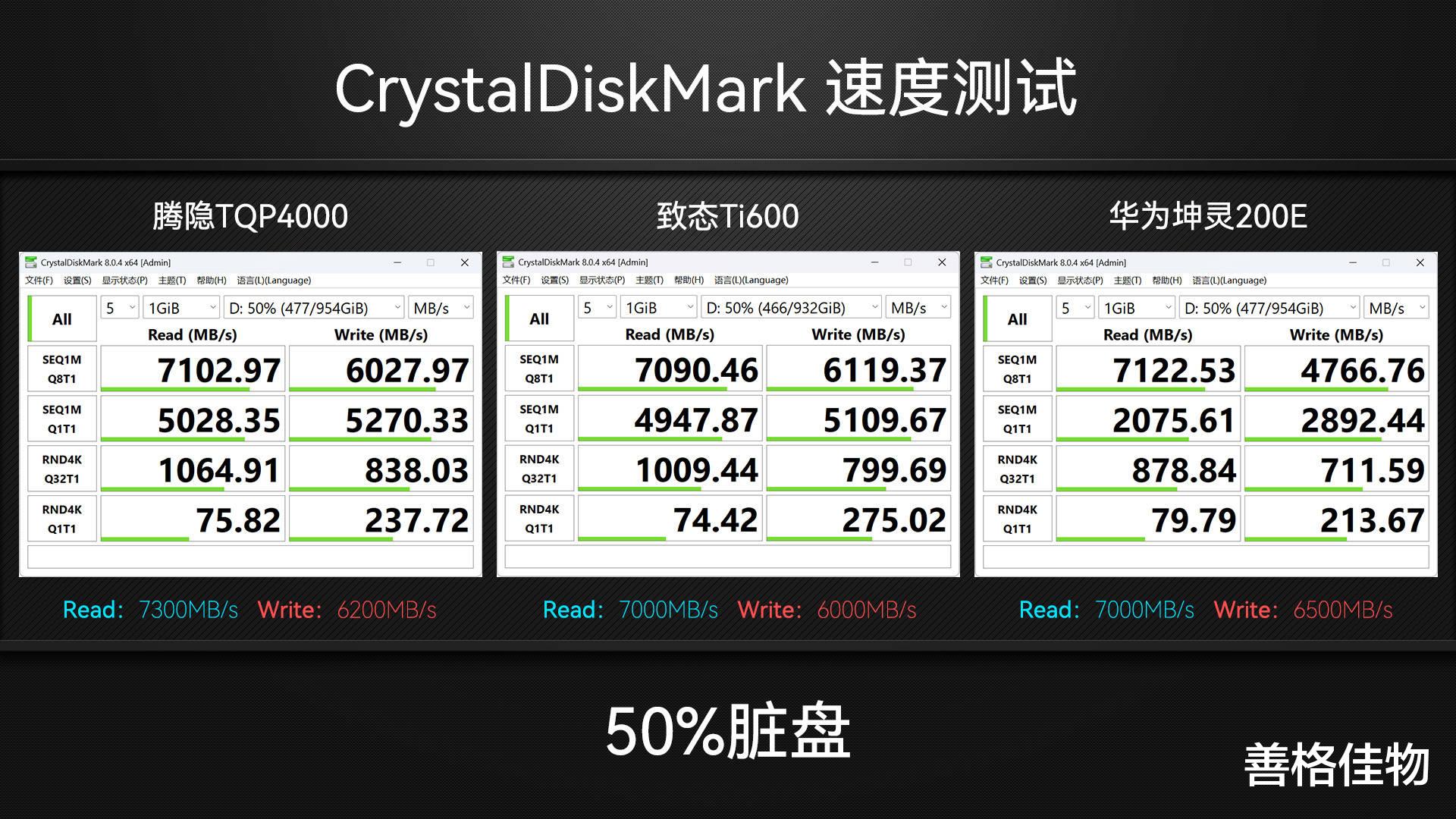 将硬盘容量填充到50%,然后进行脏盘测试,腾隐TQP4000和致态Ti600的CrystalDiskMark读写速度没有发生太大的变化,基本与空盘状态保持一致水准,华为坤灵200E的顺序读写也无改变,但Q1T1的读取速度再次腰斩,注意,这里所有测试都是在系统状态最优时进行的。