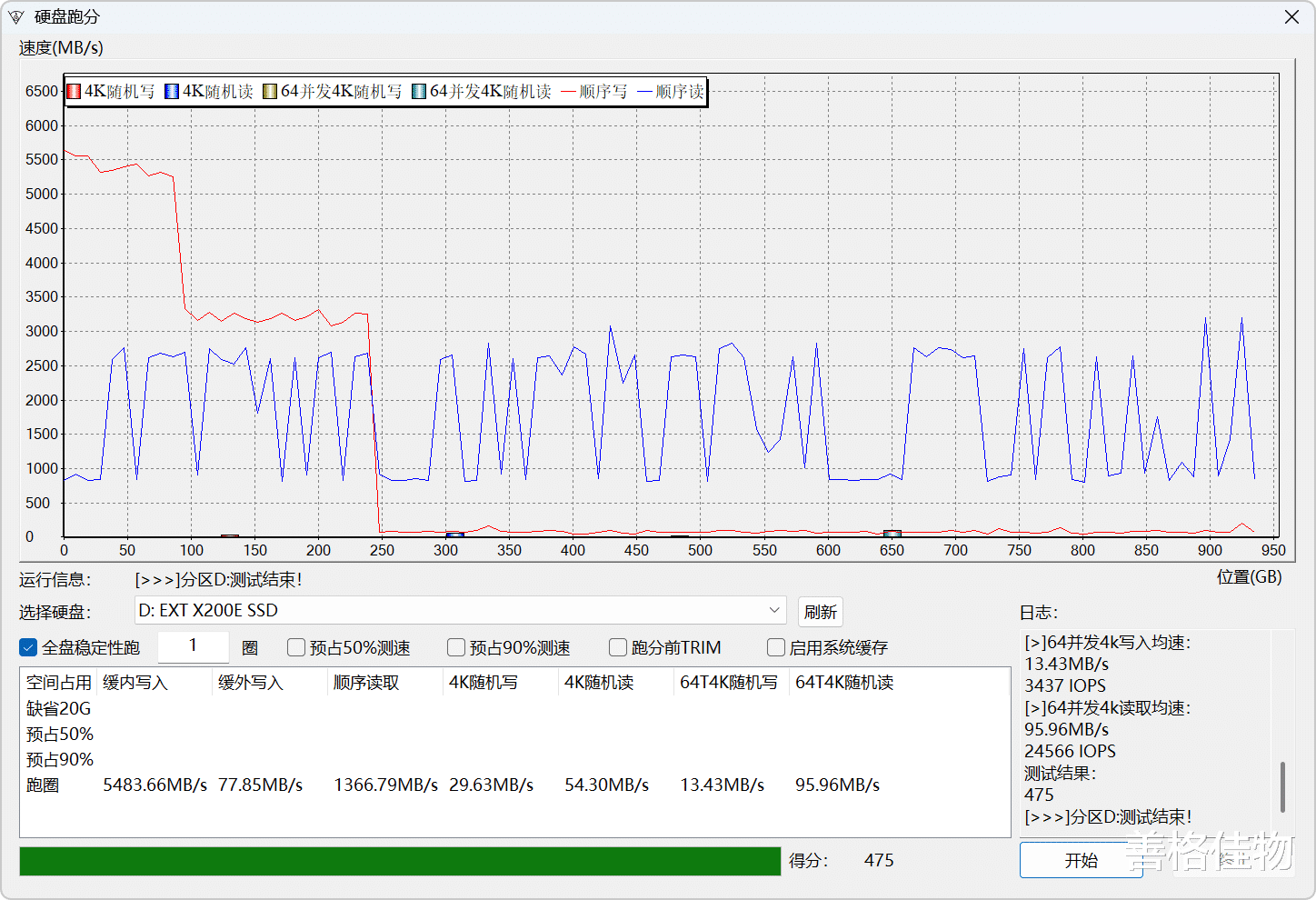 华为坤灵200E,250GB模拟缓存,缓内两段式写入速度,前100GB在5300MB/s左右,100GB-250GB间为3200MB/s左右,出缓后的QLC直写速度只有77MB/s左右,而读取速度这条曲线有些坎坷,HD Tune测试的时候就觉得读取速度不太正常,这里再一次印证,不知道问题出在哪里,最终得到的结果只有区区的1300MB/s左右,综合得分475,仅有其它两款的一半多点。
