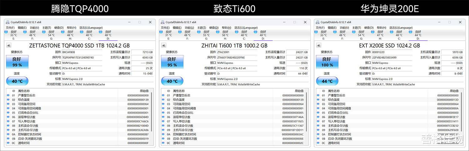 CrystalDiskInfo检测,均支持PCIe4.0 x 4,腾隐TQP4000的固件版本为:BXCAFB80,待机温度40℃,致态Ti600的固件版本为:ZTA2300,待机温度40℃,华为坤灵200E固件版本为:00001220,待机温度44℃。