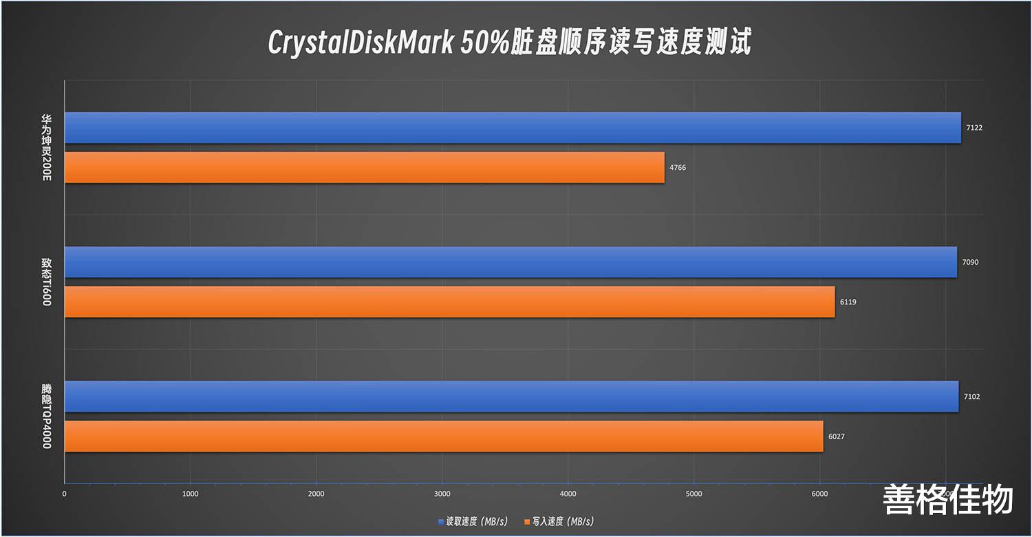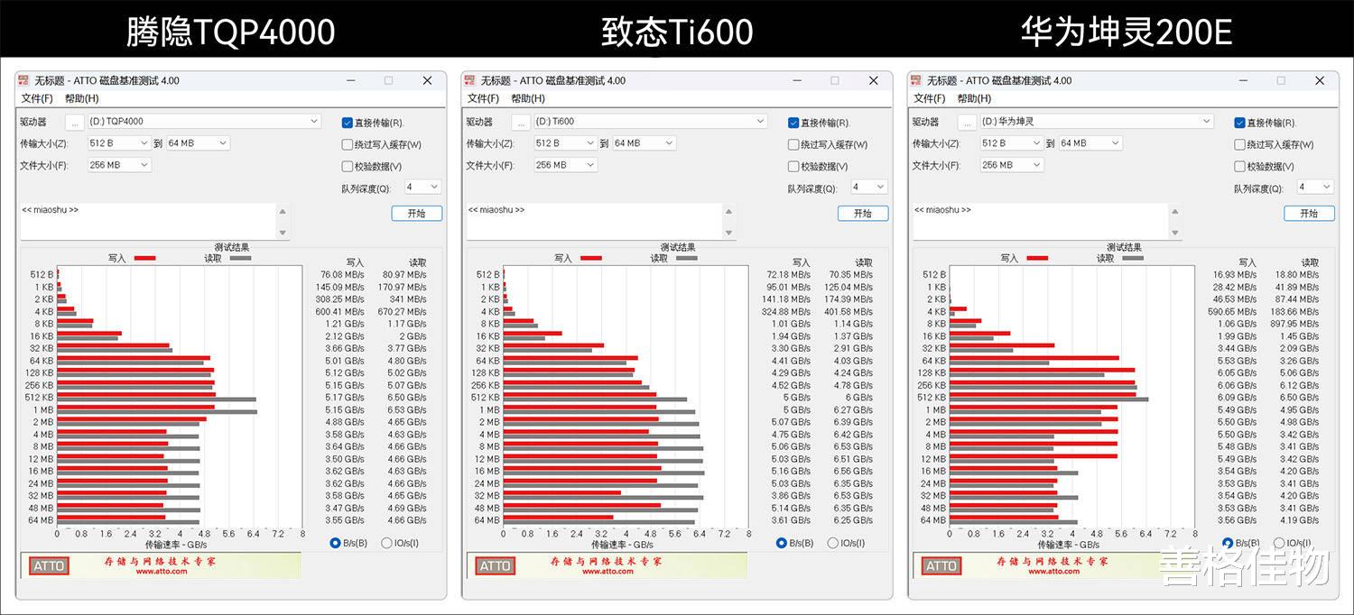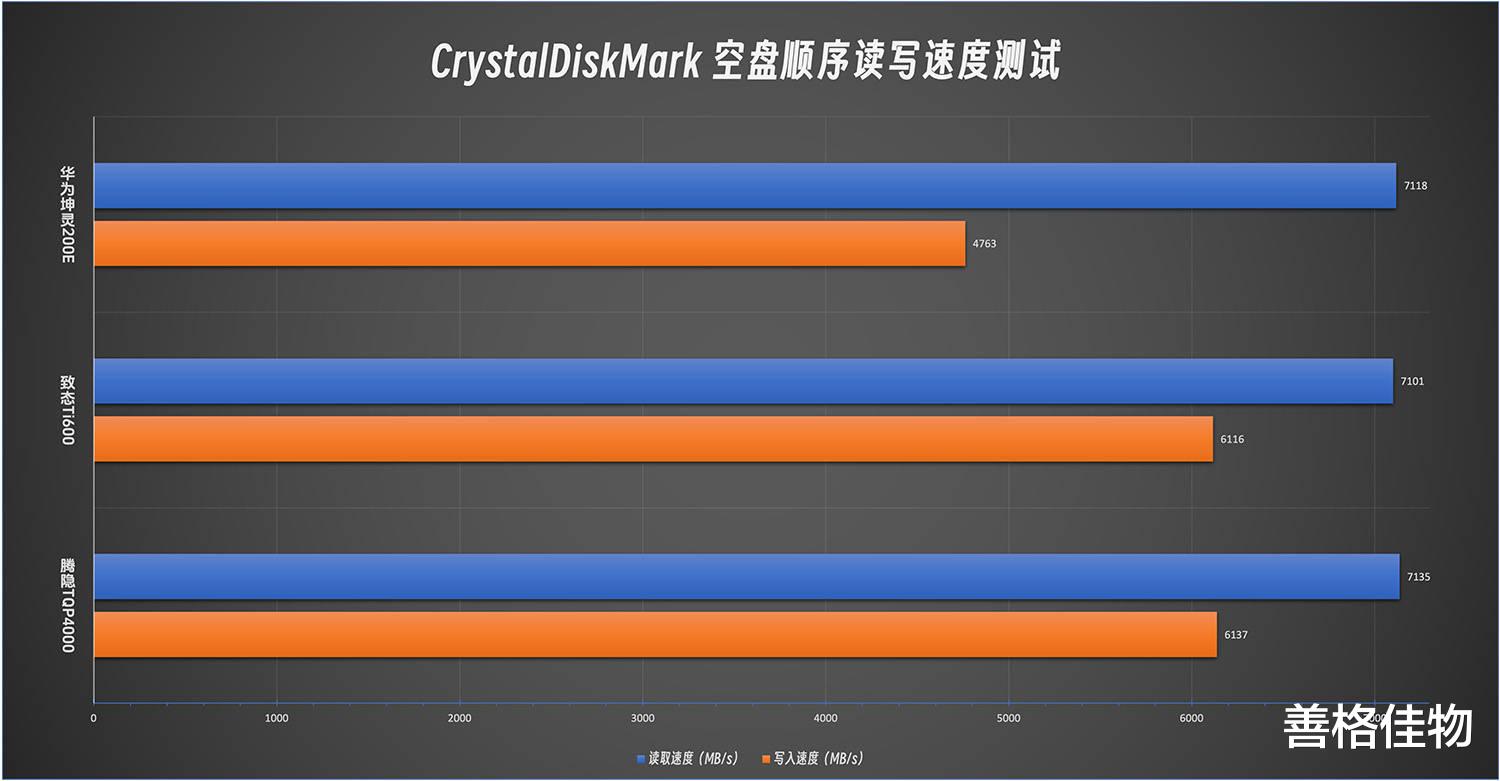 图表展示,腾隐TQP4000和致态Ti600的表现非常接近,华为坤灵200E的数据柱明显要短一截。