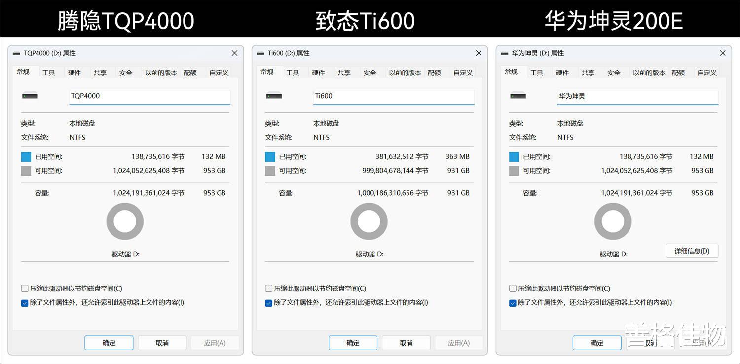 1TB容量是目前主流选择,作为系统盘、游戏盘、缓存盘都够用,3款固态硬盘在Windows下格式化后的容量,腾隐TQP4000和华为坤灵200E都是953GB,致态Ti600略少一些,为931GB。