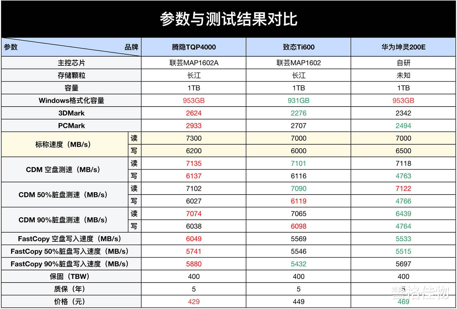 最后,将所有参数与测试结果放到表格中进行直观对比,就本次测试来看,腾隐TQP4000的表现比较亮眼,其实除去那些可以忽略不计的差距,致态Ti600与腾隐TQP4000可以说是相差无几,价格方面比腾隐TQP4000贵了20元,选择哪个都没毛病。华为坤灵200E的价格略贵,而且测试结果也不尽人意,基本上可以在备选项中拿掉了。
