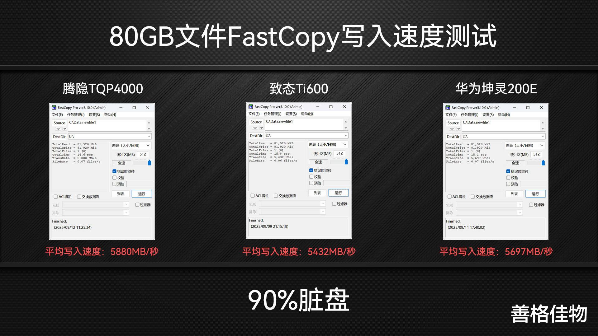 FastCopy同样进行80GB文件写入测试,3款硬盘都稳得一批。