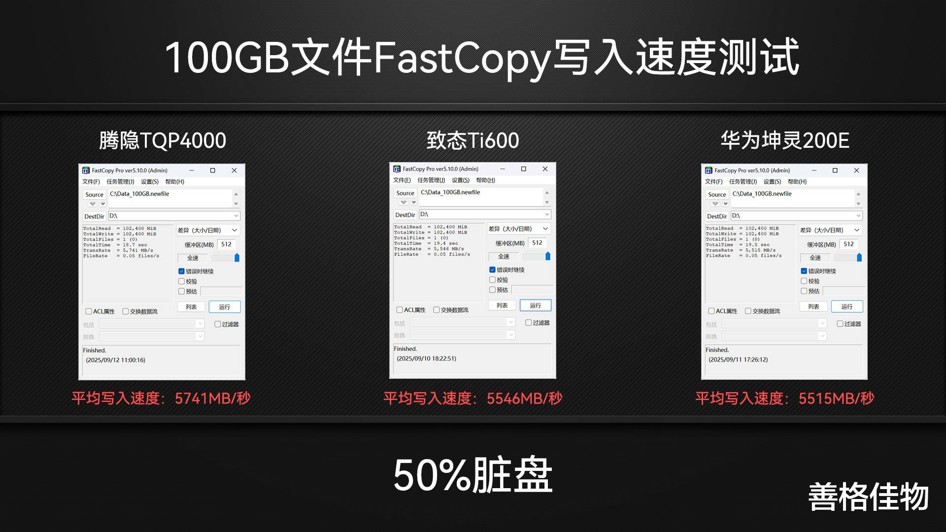 FastCopy的结果也比较令人满意,写入速度都达到了5500MB/s以上,腾隐TQP4000比空盘状态下出现略微下降,但在合理波动范围内,无伤大雅,并且依旧领跑。