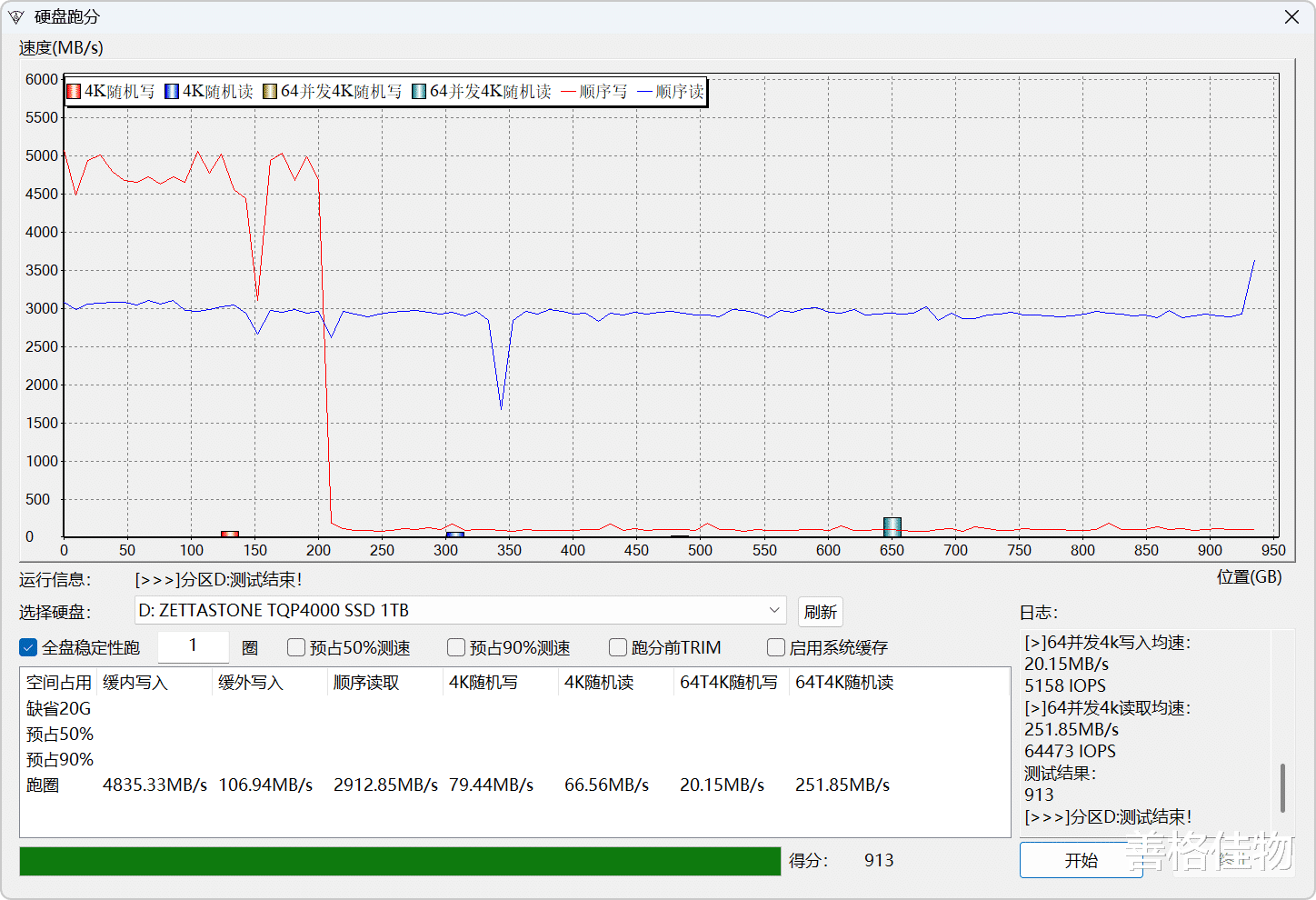 进行测试的这3款SSD硬盘,都没有物理缓存,而是采用了模拟SLC缓存机制,软件跑分测试不够全面,进行一次全盘写入才能展现硬盘的真实水准。第一个上场的是腾隐TQP4000,从曲线变化可以看出,模拟缓存为200GB,缓内平均写入速度为4835MB/s,出缓后的写入速度为106MB/s,是的,只有106MB/s,这就是QLC的痛,读取速度比较稳定,2900MB/s左右,综合得分913。