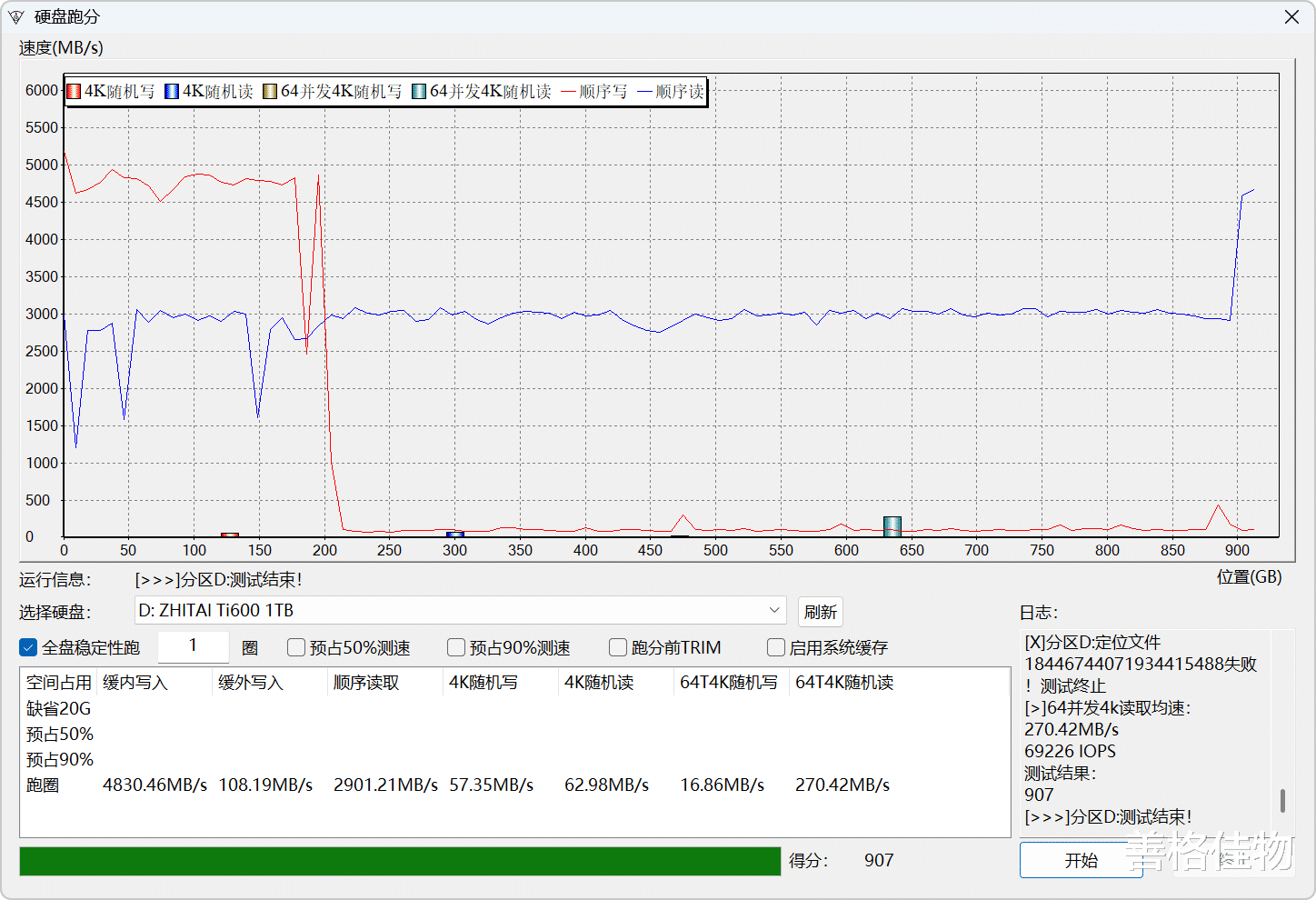 致态Ti600整体表现与腾隐TQP4000非常接近,同样是200GB SLC模拟缓存,缓内写入4830MB/s,缓外QLC直写速度108MB/s,读取速度2900MB/s左右,综合得分907。