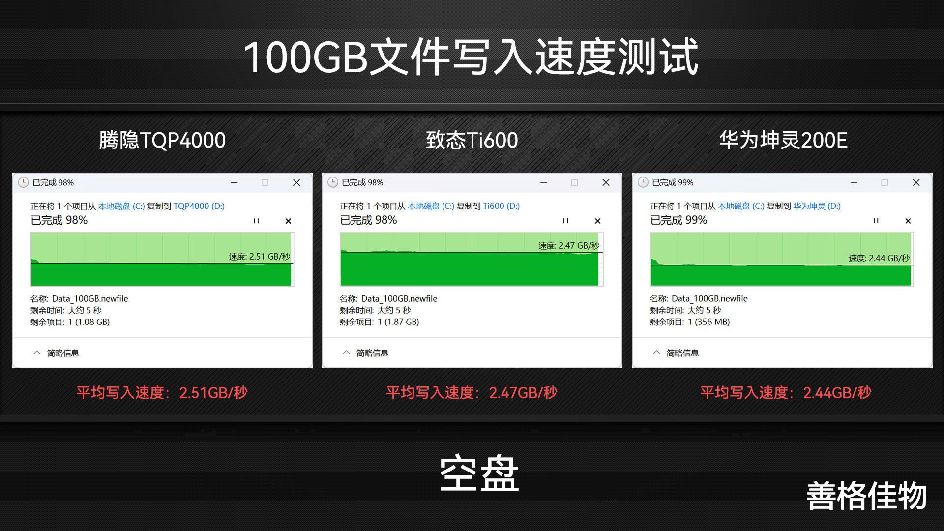 接下来进行100GB大文件空盘实际写入测试,3款硬盘的表现都很稳定,始终都维持在2.5GB/s左右,中间没有出现掉速的情况。
