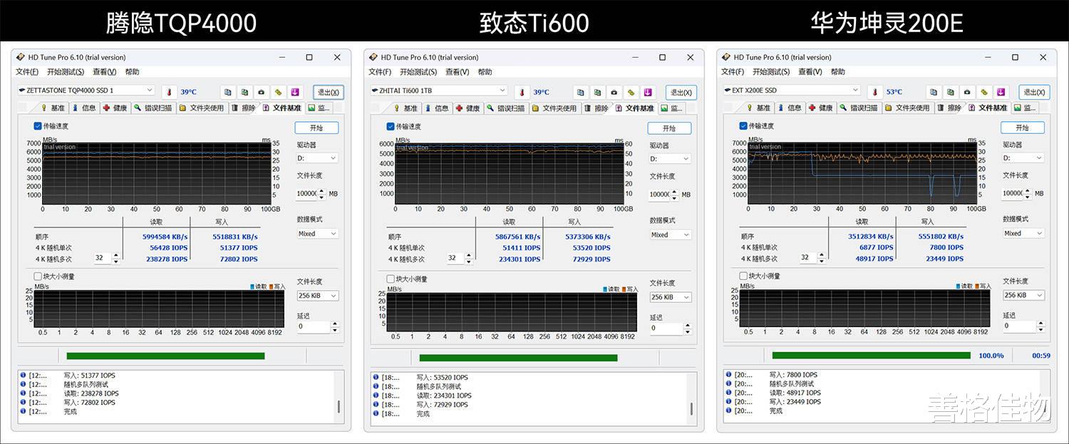 HD Tune 100GB文件基准测试中,腾隐TQP4000和致态Ti600的读写都非常稳定,从头到尾2条直线,致态Ti600在60GB后出现略微波动,但不影响整体表现,华为坤灵200E的走势就有点令人迷惑了,写入速度在10GB节点出现小幅震荡,30GB后持续波动直至结束,总体来说还算过得去吧,但读取速度这条两段式的曲线,尤其是在80GB和90GB两个节点的断崖式波谷,实在让人无法理解,为何如此?