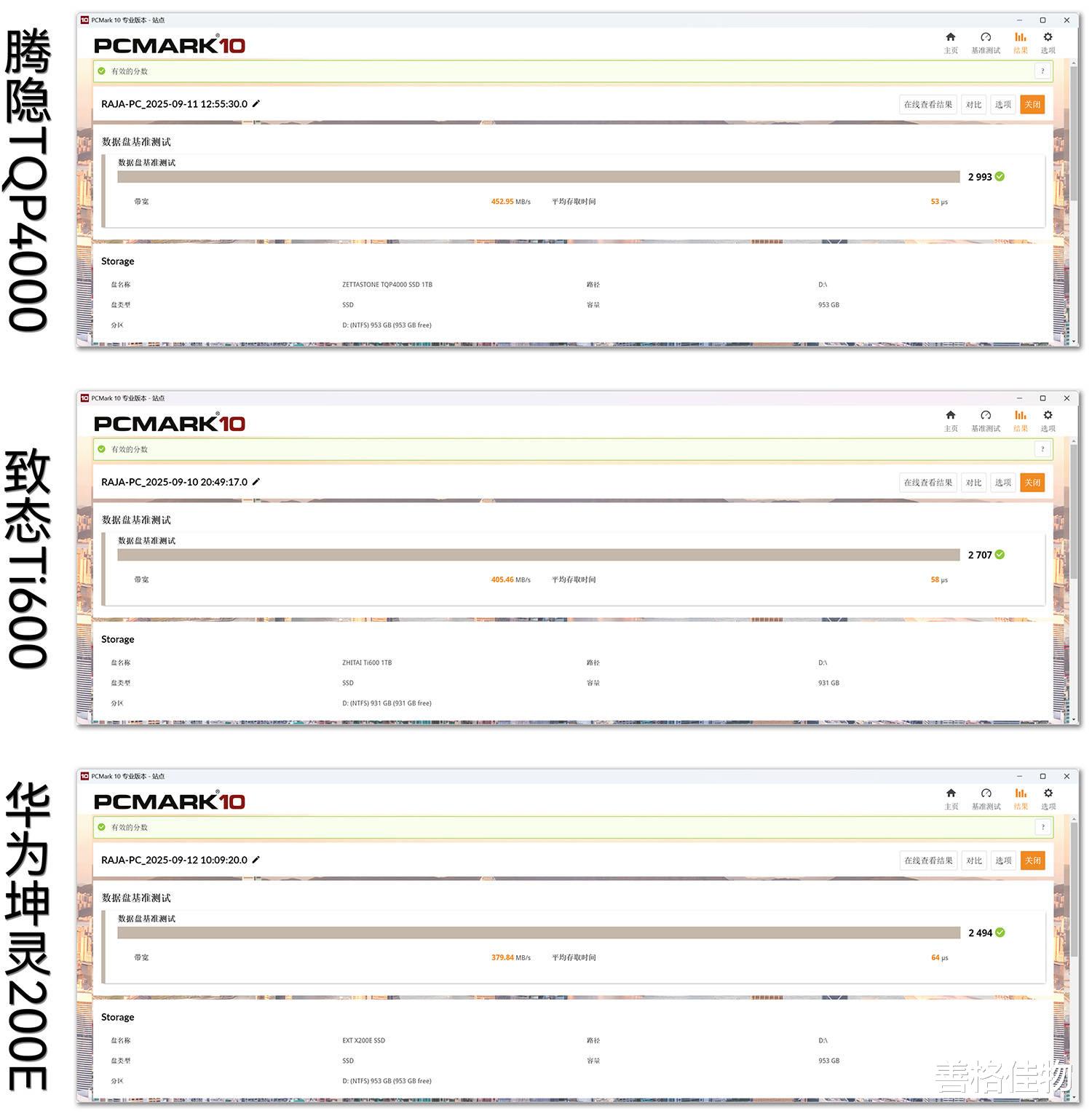 PCMark测试结果,腾隐TQP4000:2993分,致态Ti600:2707分,华为坤灵200E:2494分。