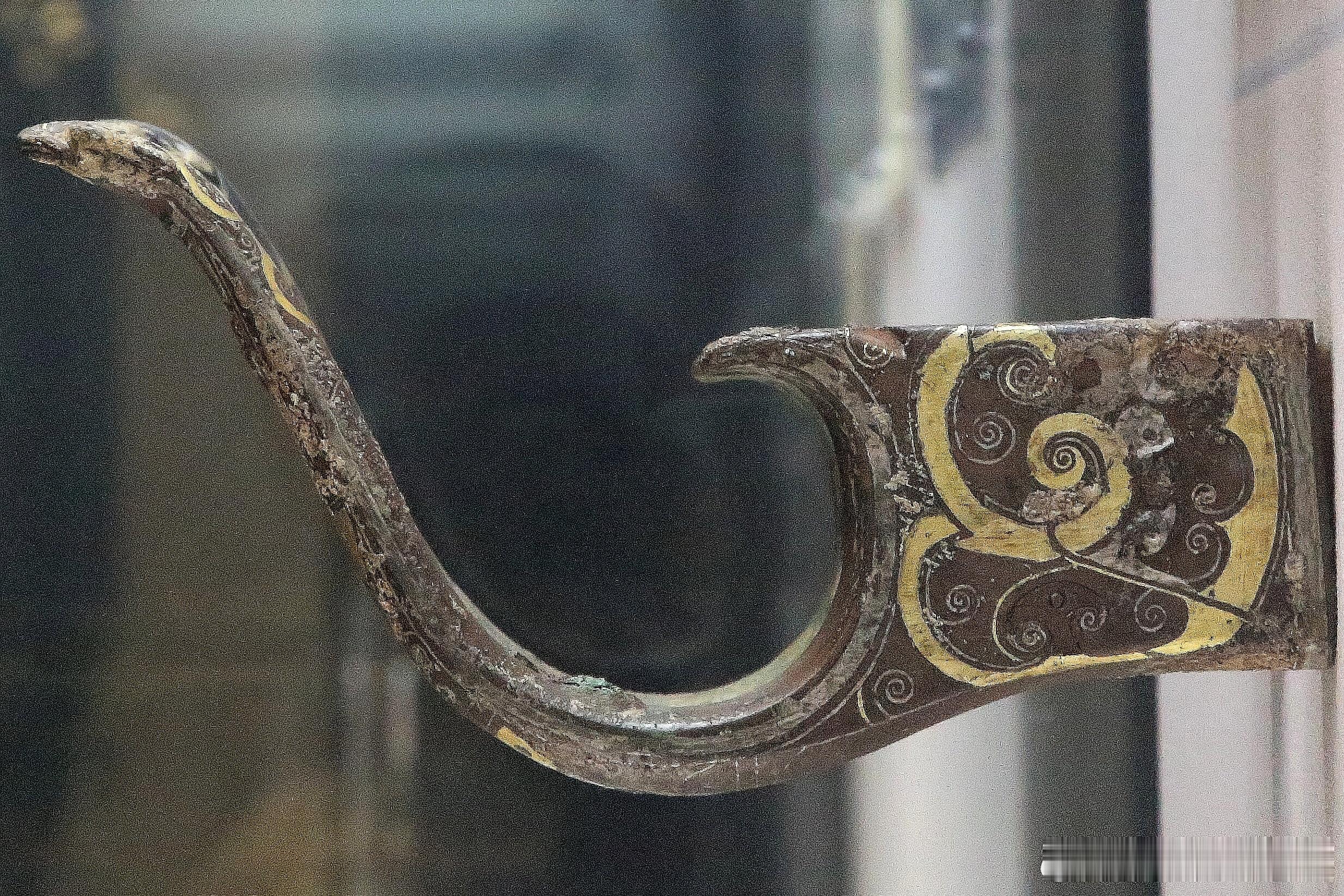 这对豪华精美的兽头状的承弩器通体用金和银嵌错漩涡状的流云纹,色彩艳丽。
