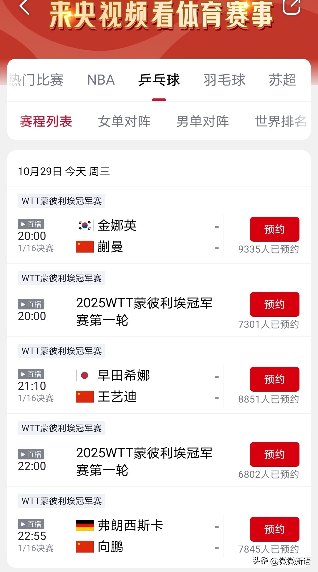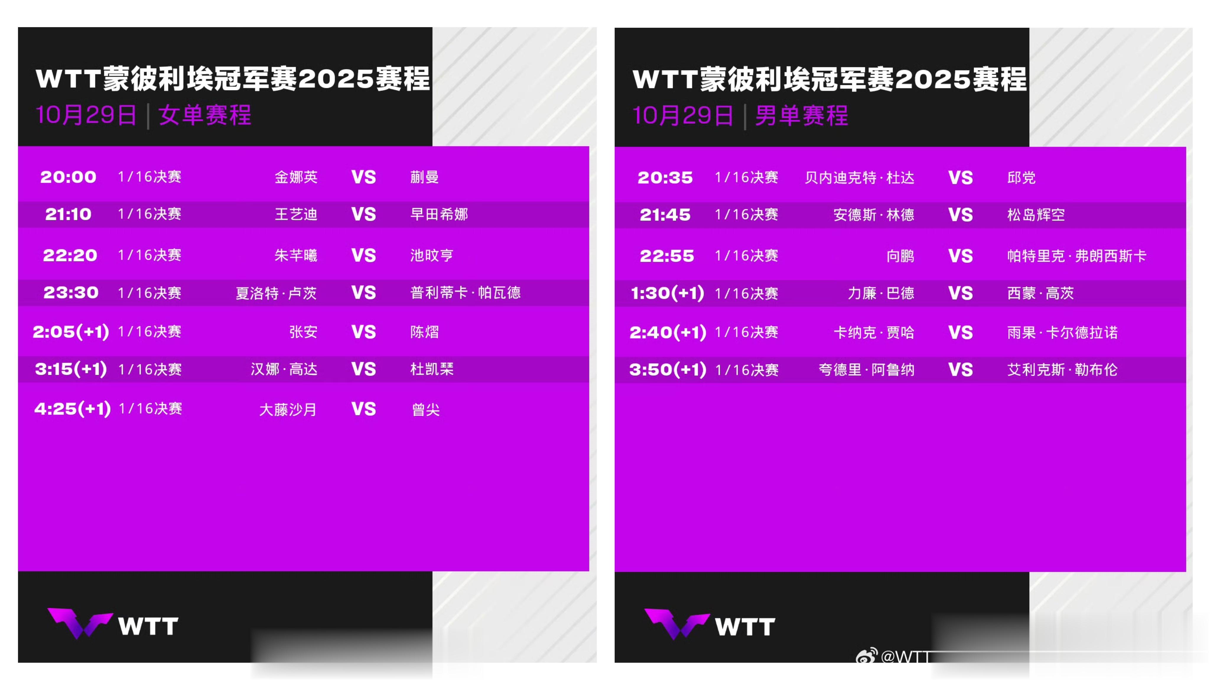 看到WTT蒙彼利埃冠军赛10月29日的赛程已经出来了,国乒今天一共有四场比赛,今天的比赛还是1/16决赛,一起来看一下中国队具体赛程: