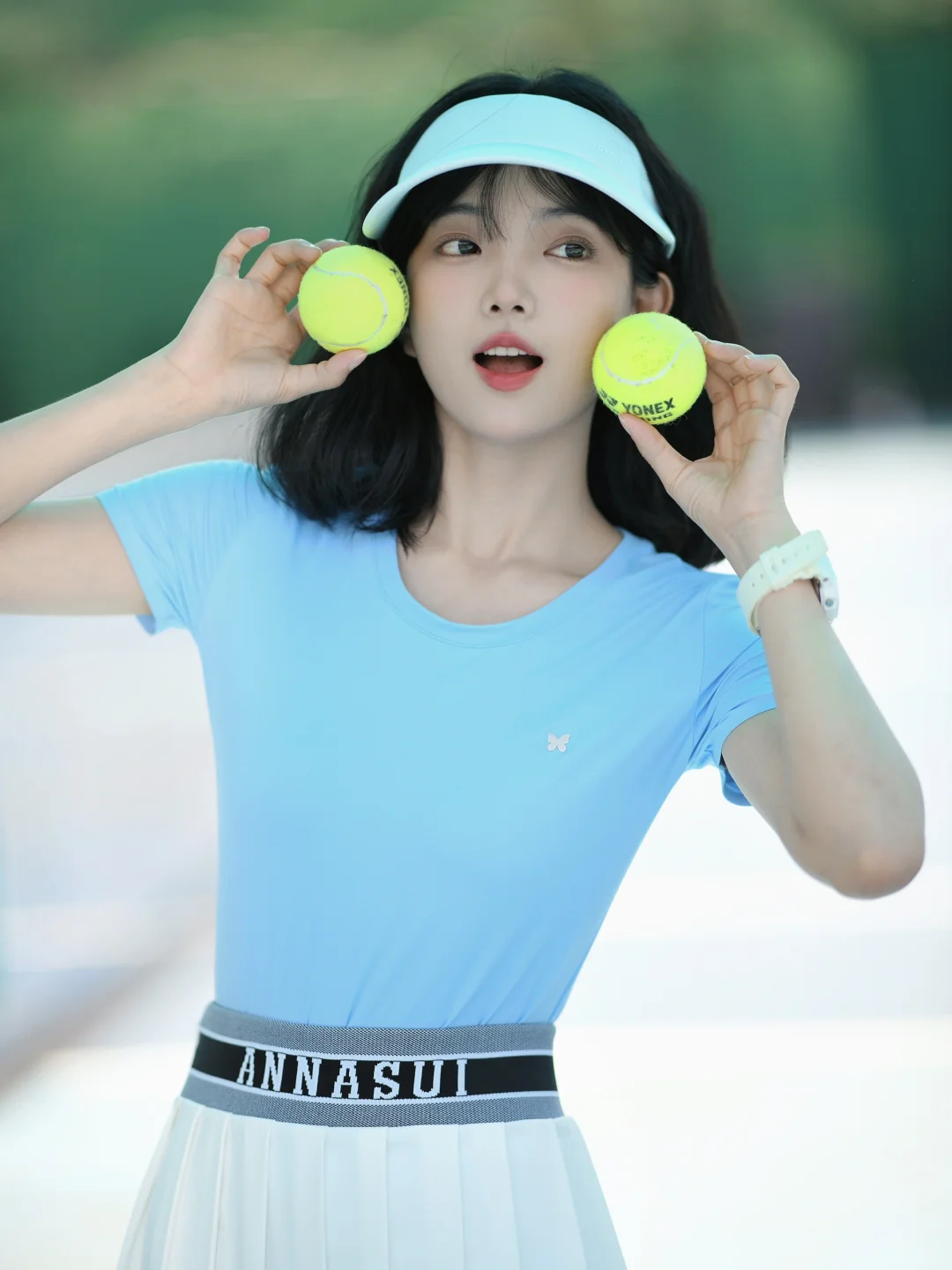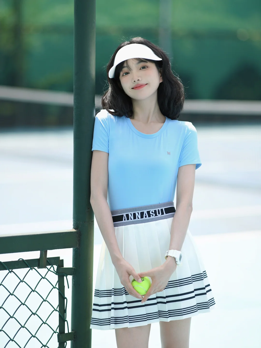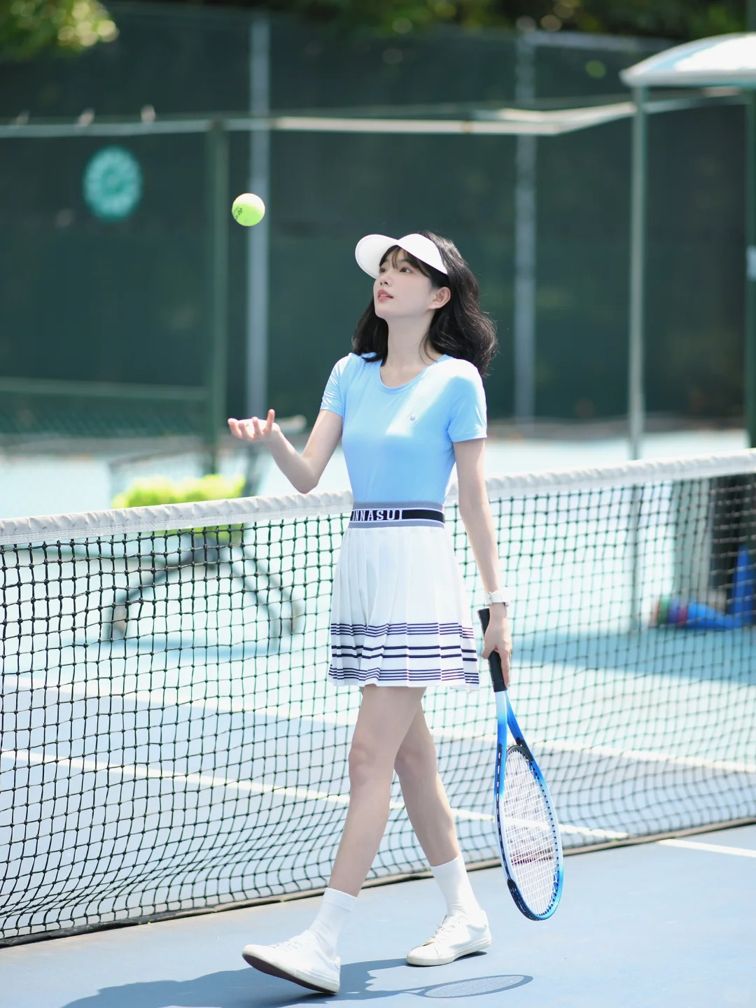 . 感觉自己是向日葵人格!🌻 喜欢夏天 看见阳光心情就很明媚~ 决定约上搭子出门去 做半天网球女孩👧享受出汗的快乐 这套网球服完美踩中我的心巴💙 夏天穿蓝色好显白✌简洁的修身T恤 穿上像棉花糖一样软糯☁️ 凉凉的很亲肤 运动后出汗也不会感觉黏腻 高腰百褶裙把身材比例划分的刚好 挥动球拍时裙摆有飘逸的灵动感 日常运动也可以甜美出动❕ 感觉身上充满了动漫少女的元气氛围✨