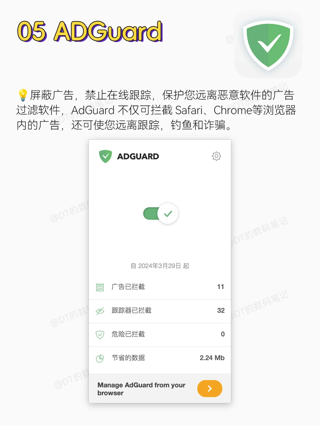 屏蔽广告,禁止在线跟踪,保护您远离恶意软件的广告过滤软件,AdGuard 不仅可拦截 Safari、Chrome等浏览器内的广告,还可使您远离跟踪,钓鱼和诈骗。