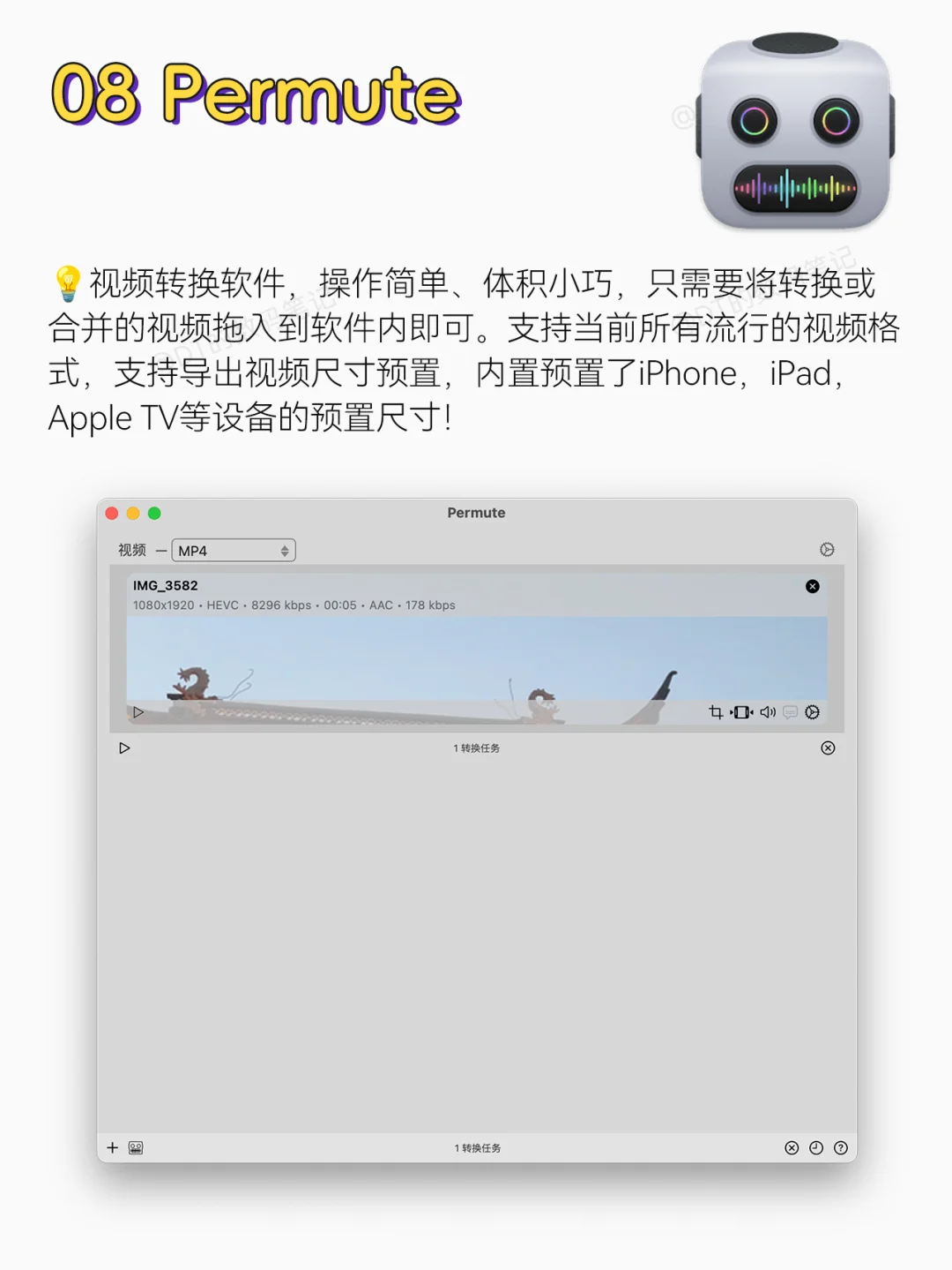 视频转换软件,操作简单、体积小巧,只需要将转换或合并的视频拖入到软件内即可。支持当前所有流行的视频格式,支持导出视频尺寸预置,内置预置了iPhone,iPad,Apple TV等设备的预置尺寸!