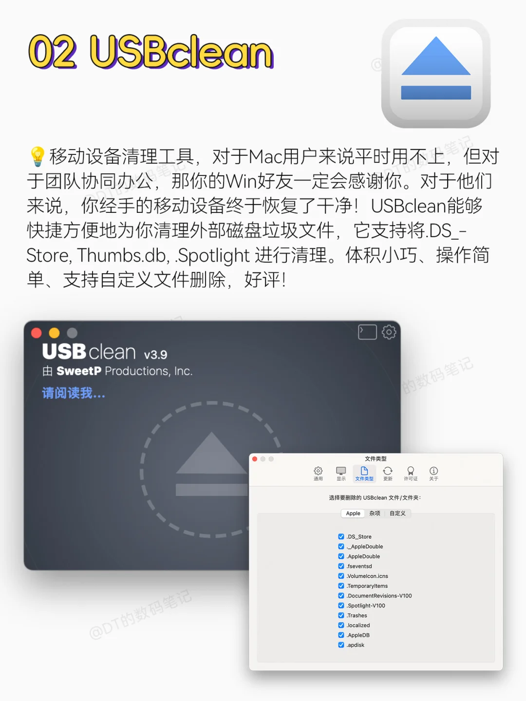 移动设备清理工具,用了以后你的Win好友一定会感谢你。对于他们来说,你经手的移动设备终于恢复了干净!USBclean能够快捷方便地为你清理外部磁盘垃圾文件,它支持将.DS_Store, Thumbs.db, .Spotlight 以及回收站中的垃圾文件进行清理。体积小巧、操作简单、支持自定义文件删除,好评!
