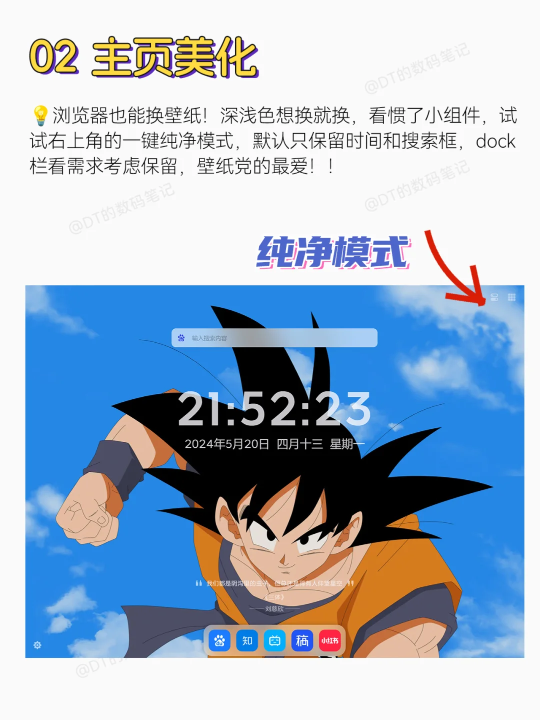 浏览器也能换壁纸!深浅色想换就换,看惯了小组件,试试右上角的一键纯净模式,默认只保留时间和搜索框,dock栏看需求考虑保留,壁纸党的最爱!!