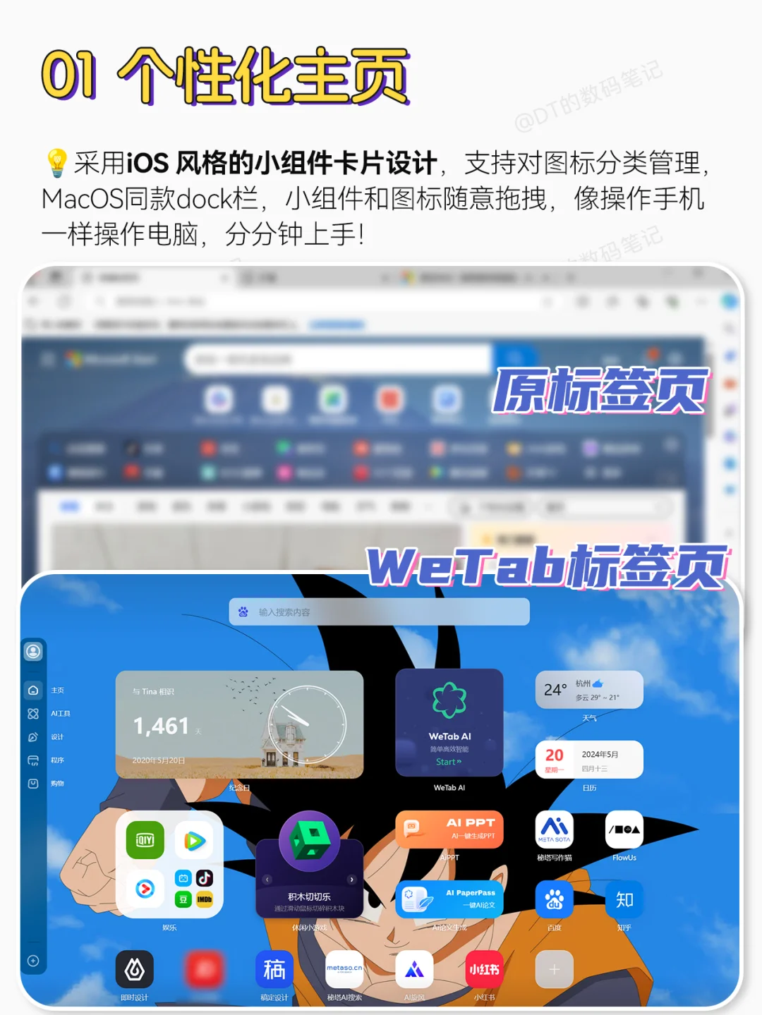 采用iOS 风格的小组件卡片设计[赞R]支持对图标分类管理,MacOS同款dock栏,小组件和图标随意拖拽,像操作手机一样操作电脑,分分钟上手!