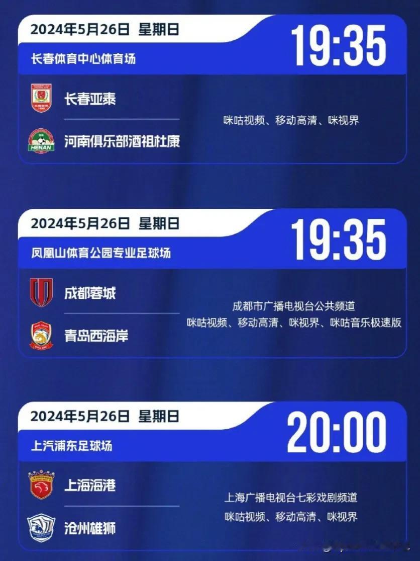 中超联赛5月26日赛程、直播预告: (第十四轮) ⌚18:00 深圳新鹏城(10分)🆚上海申花(33分) 🏟️深圳宝安体育中心体育场 📹五星体育/咪咕视频 —————— ⌚19:00 青岛海牛(9分)🆚天津津门虎(19分) 🏟️青岛青春足球场 📹天津广播电视台体育频道/咪咕视频 —————— ⌚19:00 北京国安(25分)🆚南通支云(10分) 🏟️北京工人体育场 📹CCTV5/北京广播电视台体育休闲频道/咪咕视频 —————— ⌚19:35 长春亚泰(12分)🆚河南(10分) 🏟️长春体育中心体育场 📹咪咕视频 —————— ⌚19:35 成都蓉城(25分)🆚青岛西海岸(13分) 🏟️凤凰山体育公园专业足球场 📹成都市广播电视台公共频道/咪咕视频 —————— ⌚20:00 上海海港(30分)🆚沧州雄狮(15分) 🏟️上汽浦东足球场 📹上海广播电视台七彩戏剧频道/咪咕视频