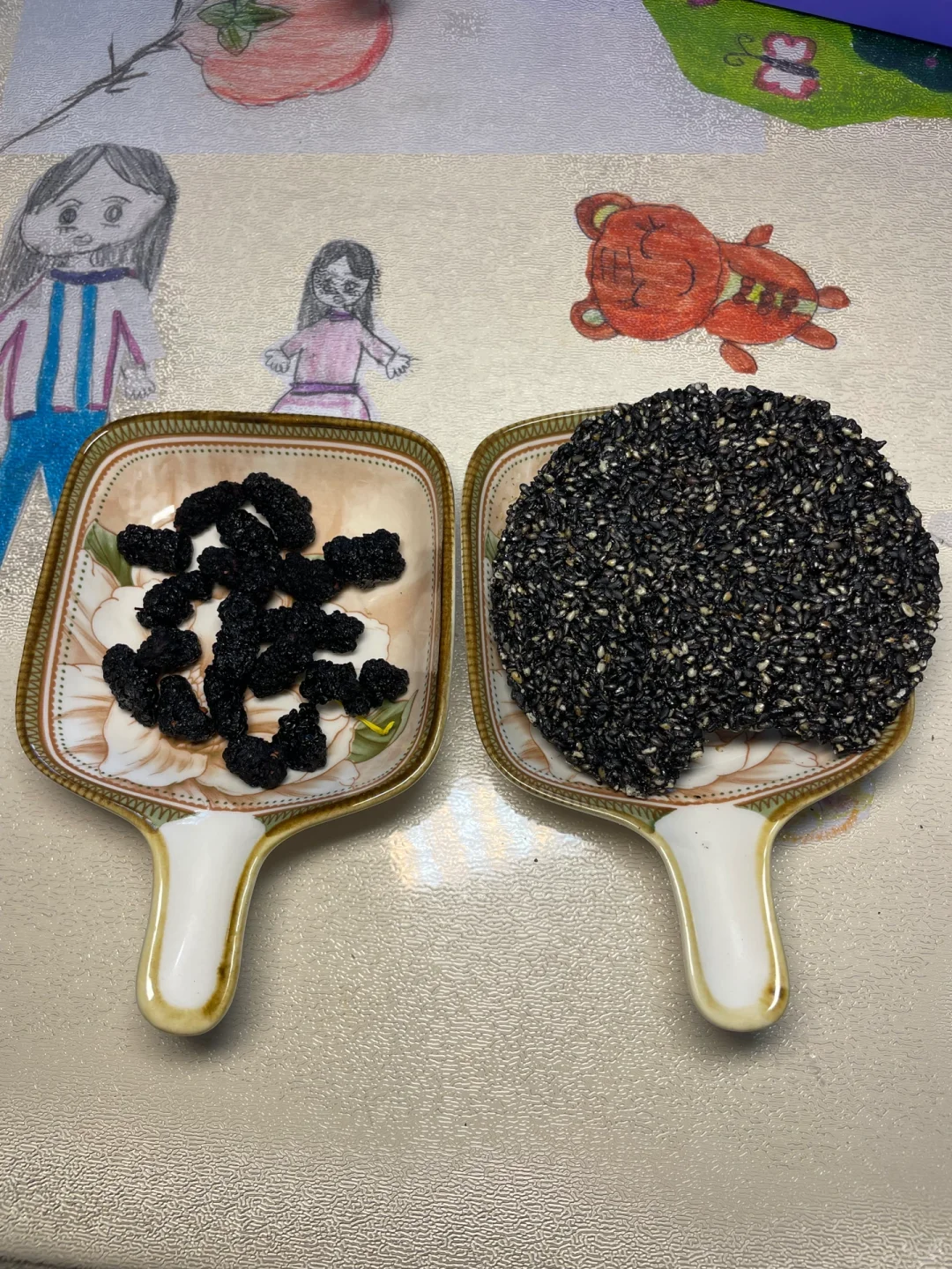 主食我们会用黑豆、黑米、黑芝麻、黑桑葚、黑枸杞打成五黑米糊,每周吃一次;