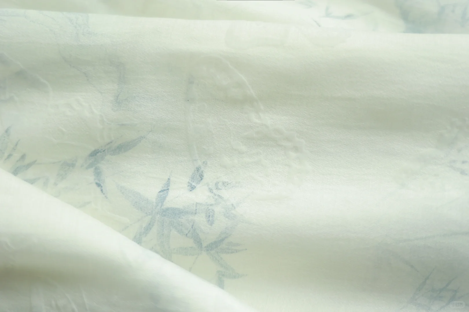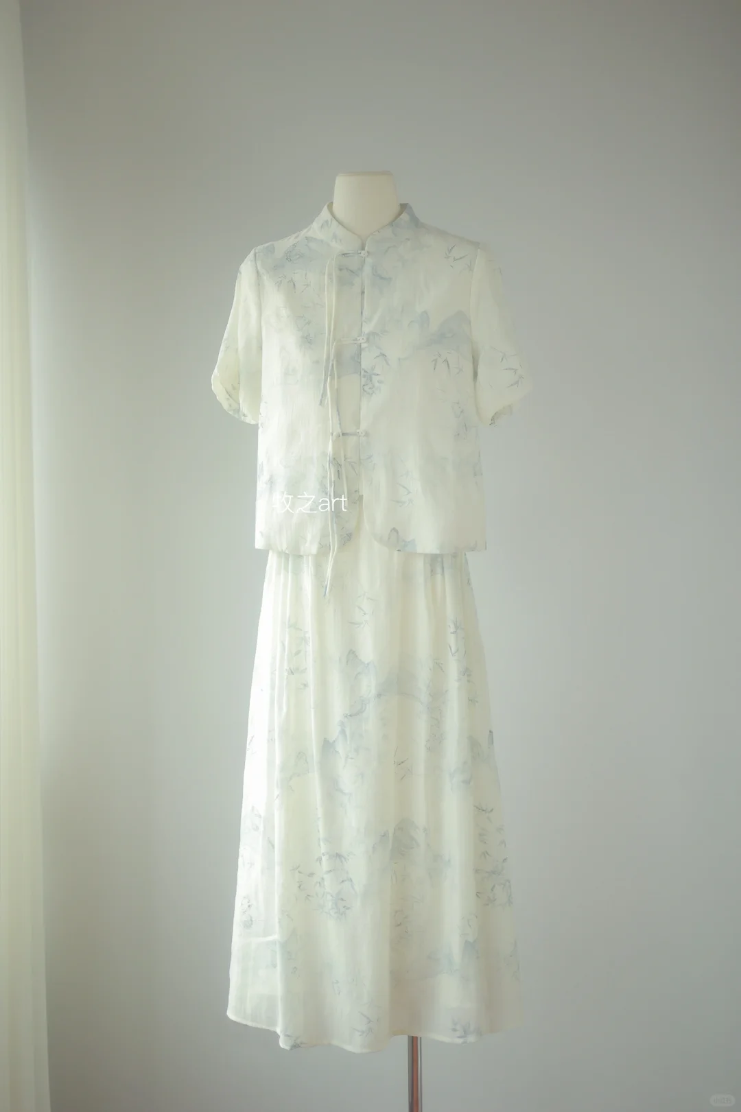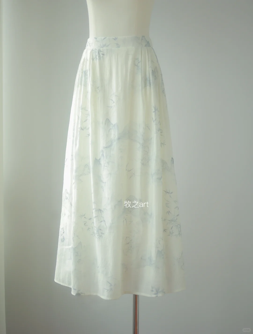 柔和淡雅的色调中光印染远山与竹 加蝴蝶提花 精致极了 上衣和半裙都是有内衬的,不会透,放心~ 上衣对襟可以解开,盘扣较灵动 版型太遮肉啦 半裙整体前面是平腰头,后面是弹力橡筋,方便穿脱 两侧有做捏褶,遮胯两侧肉肉 -
