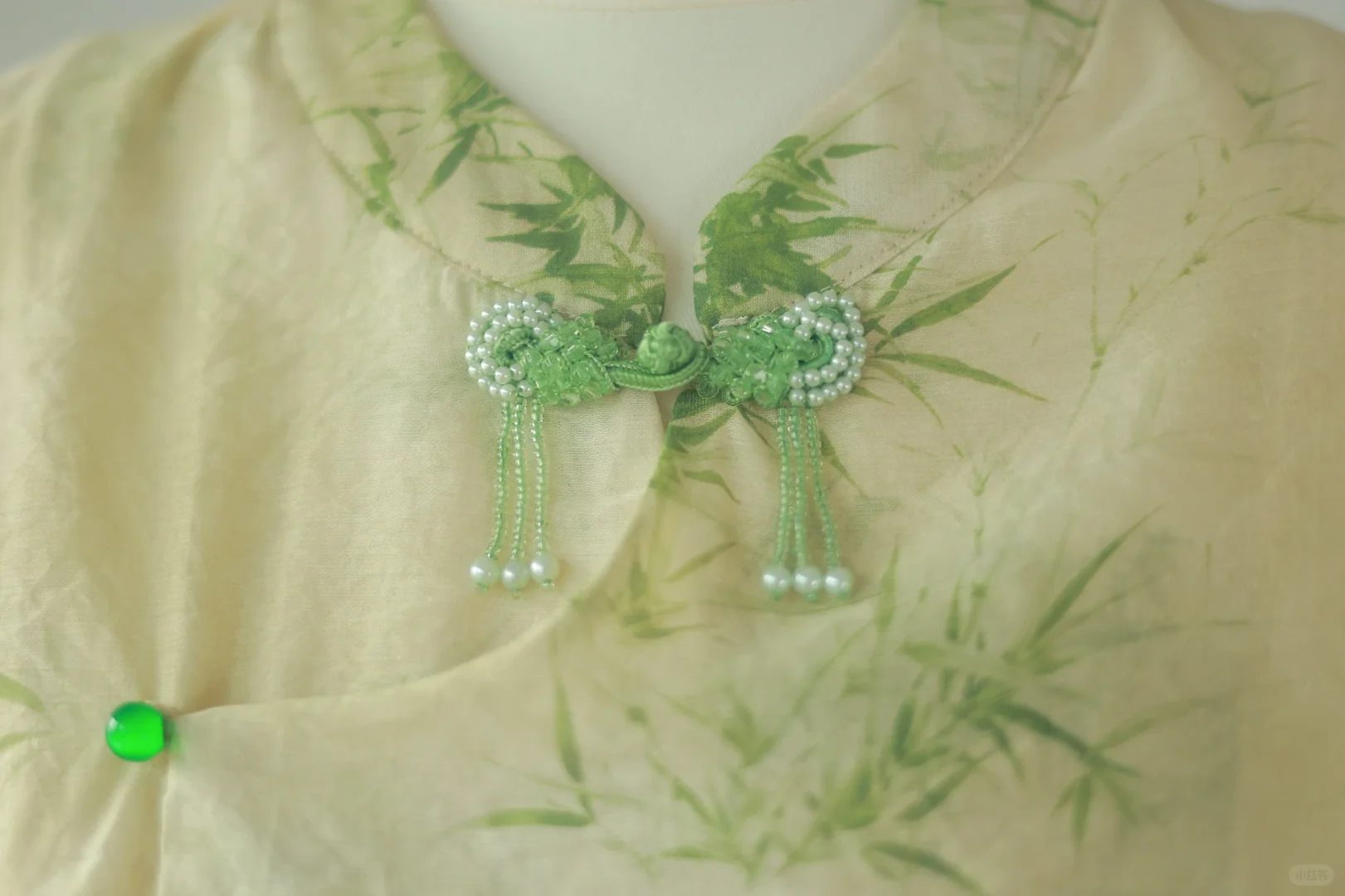 独坐幽篁里,弹琴复长啸 竹子宁静、自然 当一回软软柔柔的江南女子吧 温柔的浅色底布 与绿色的竹叶 相互映衬 清幽盈盈的气质,清冷感十足 串珠手工盘扣,复古灵动 是国风与现代审美的完美融合 看书 品茶 观展 不妨试试穿上它 -