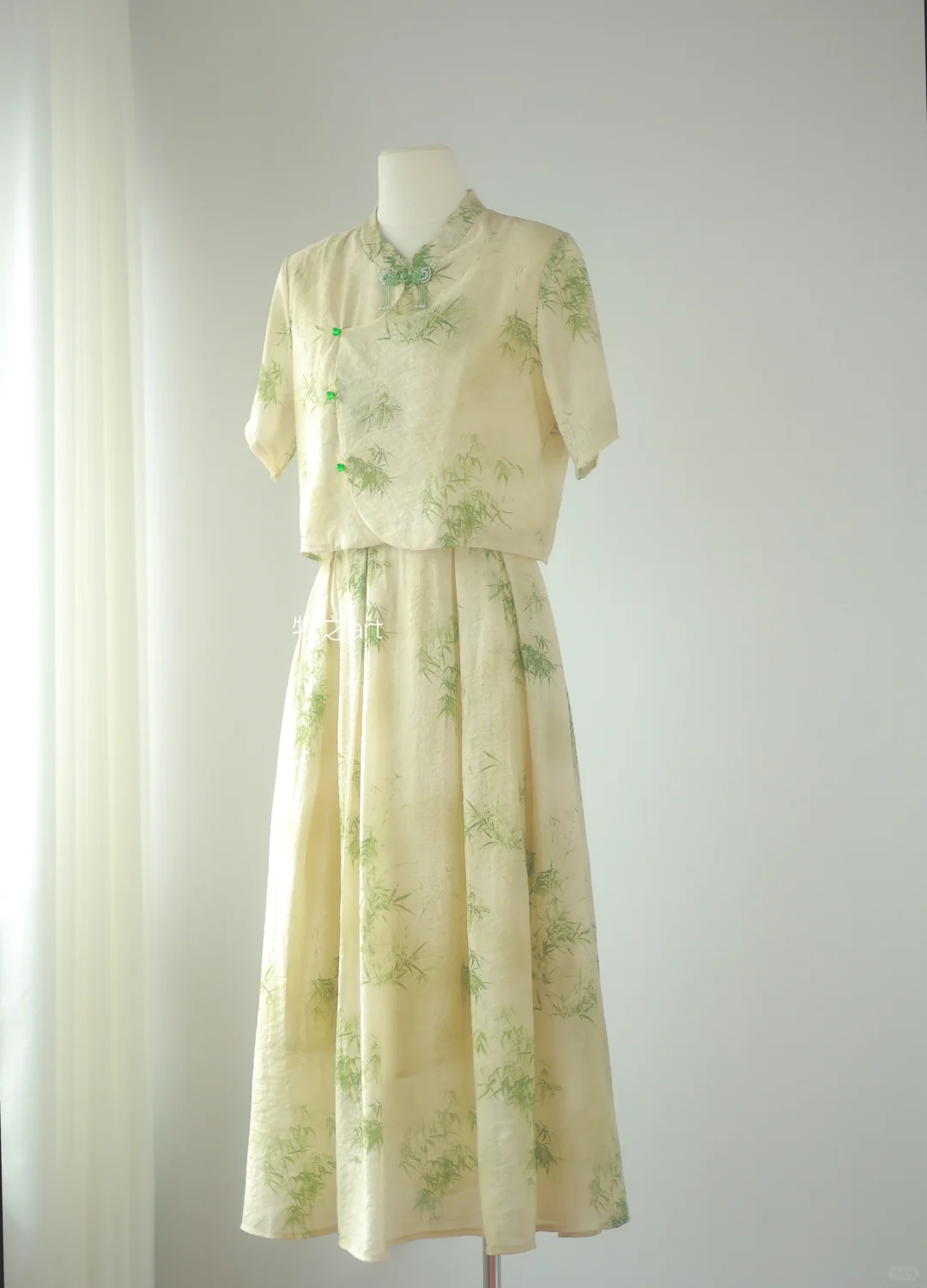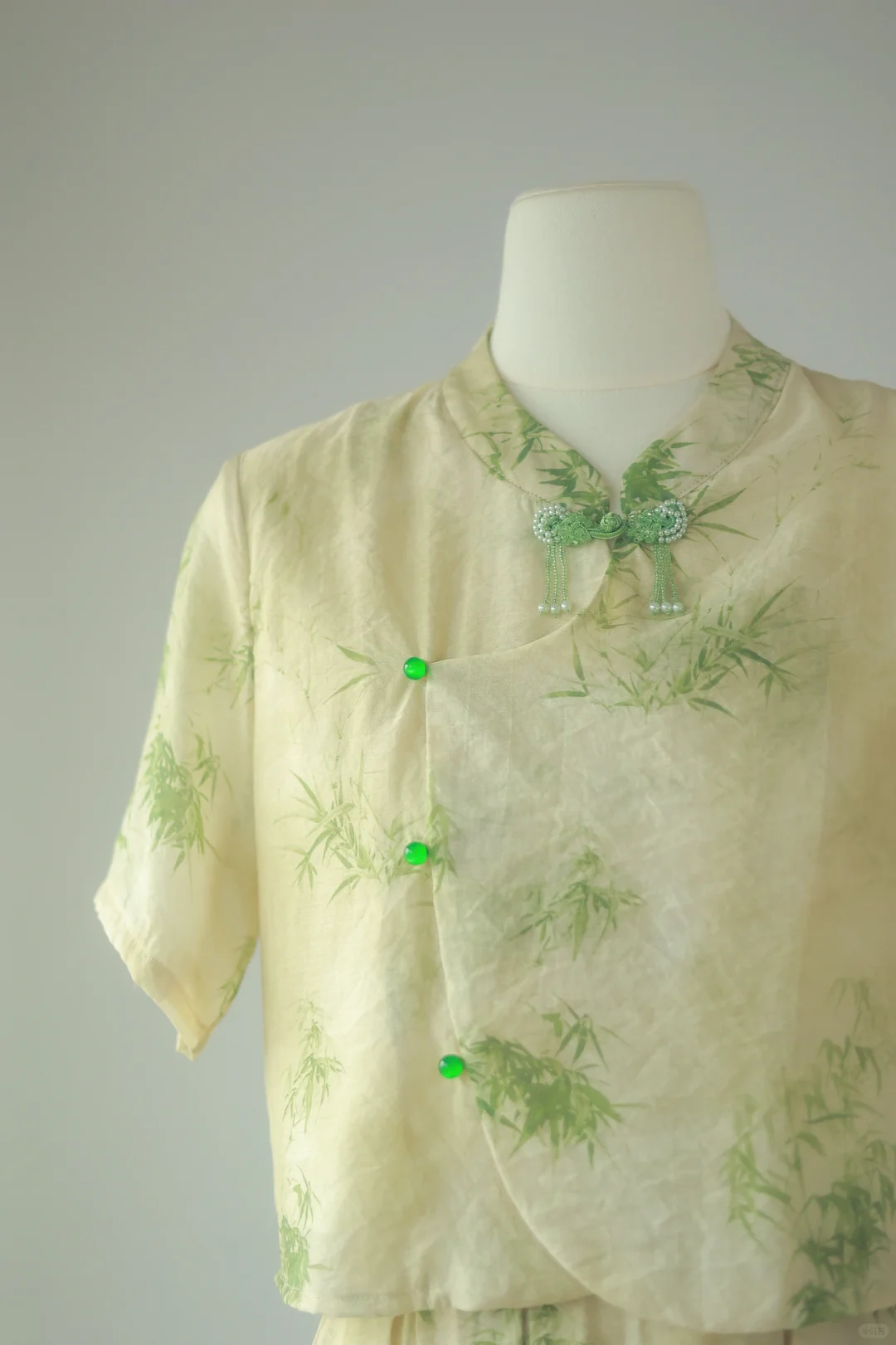 新中式穿搭风,清冷雅致中带着岁月静好的温柔,竹子印花搭配绿色,清气若兰的气质太爱了