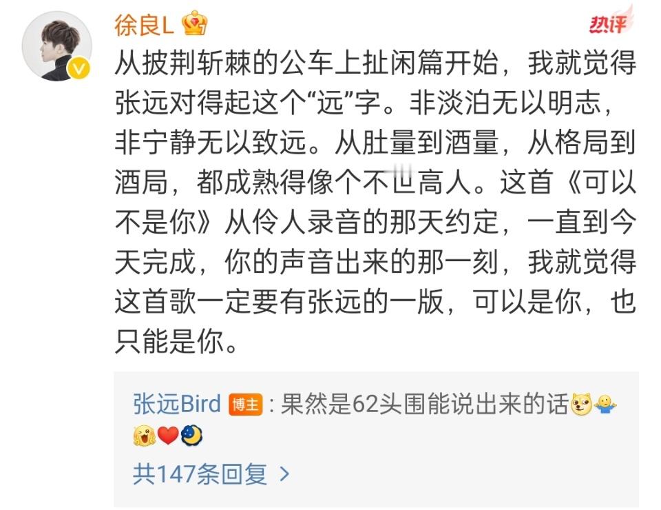 #张远徐良再合作# 张远徐良再次合作了,徐良评价张远都成熟的像个不世高人,张远回复果然是62头围能说出来的话哈哈哈哈,这俩人真是神仙组合!